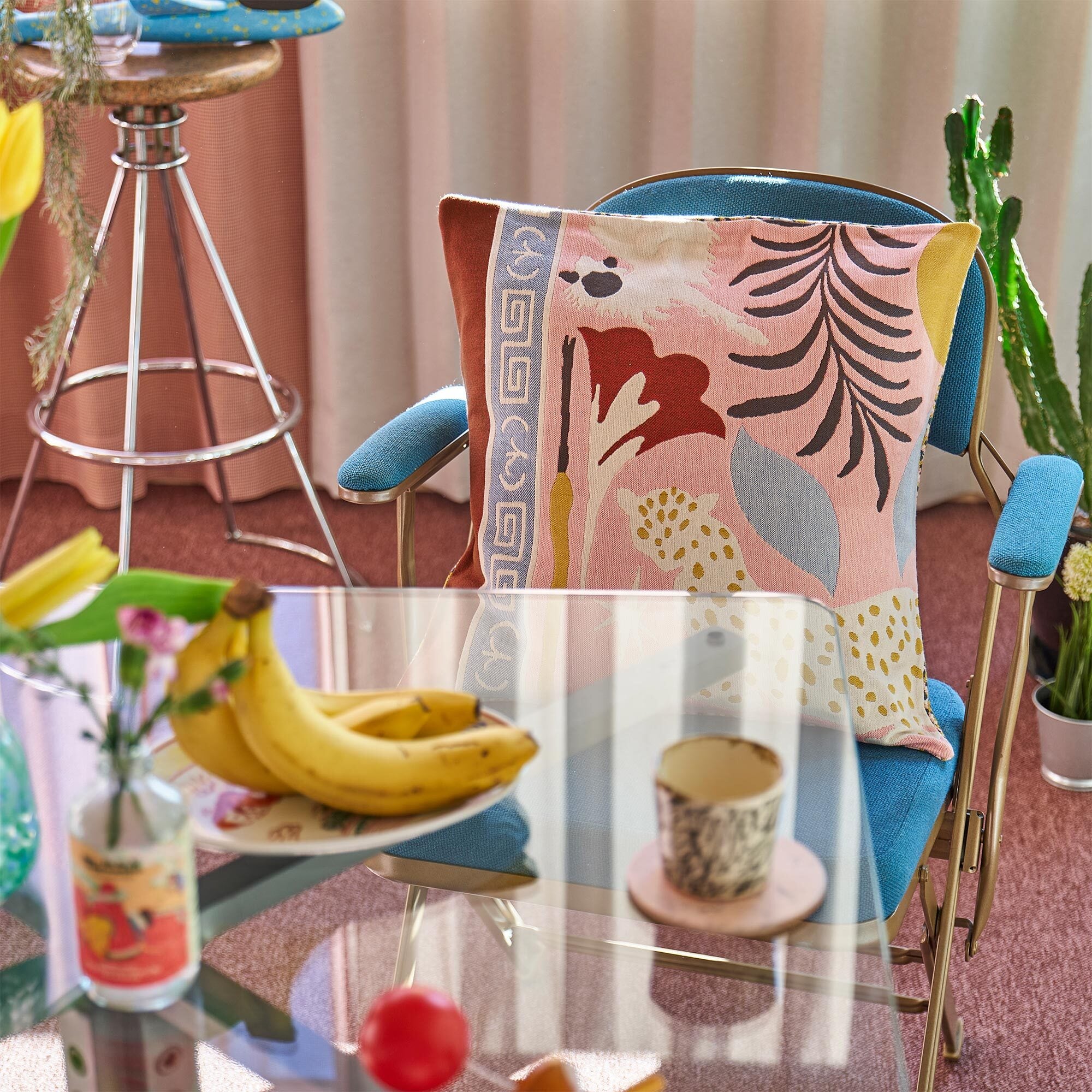 物語を切り取ったクッションカバーです。アジアの旅から着想を得たエネルギッシュなデザインです。私たちのルーツと自然の風景が溶け合うイメージをグラフィカルに構成しました。