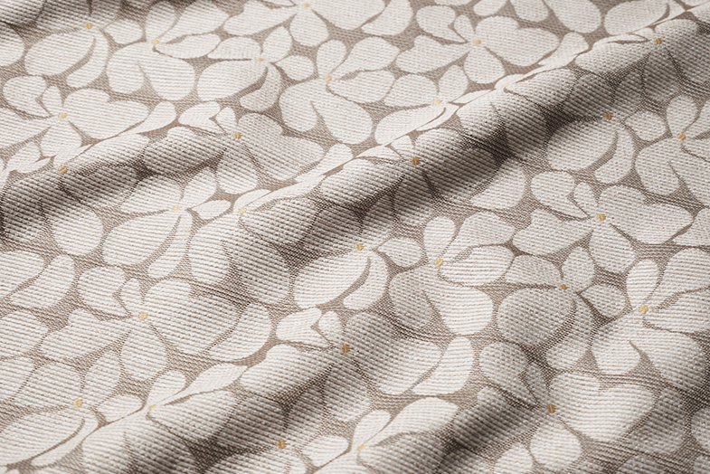 花のモチーフにはコットンに似せてつくったフワフワの糸をたっぷり使ってレトロな雰囲気になるように織っています。花芯のアクセントカラーをボーダー状に配することで全体がモダンな印象になるように工夫しました。しっかりとした生地の厚みがありながらも風合いはやわらかで、ヴィンテージファブリックのような存在感があります。