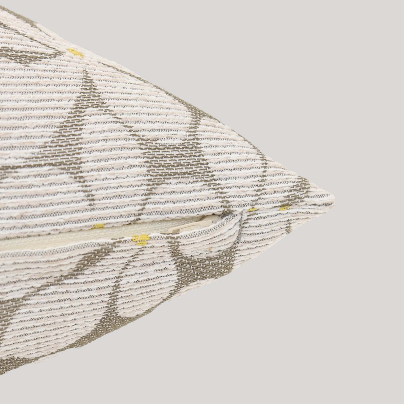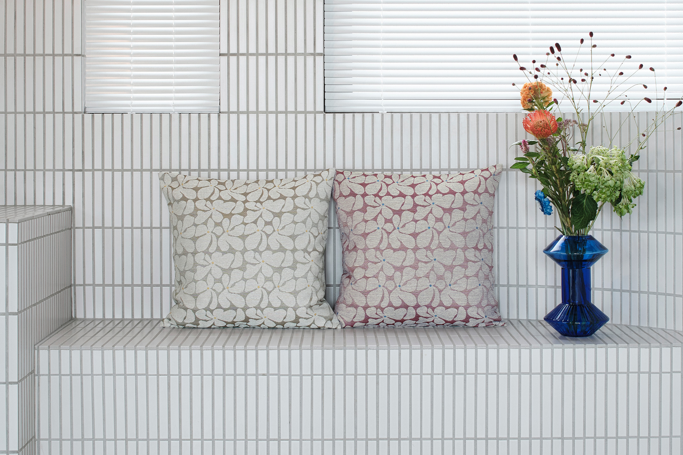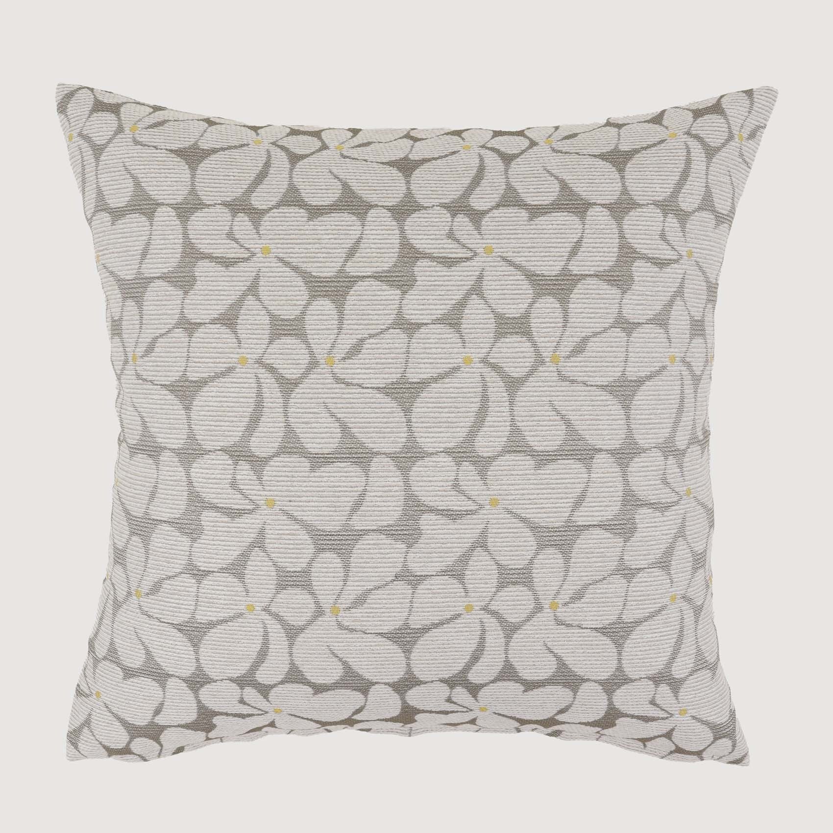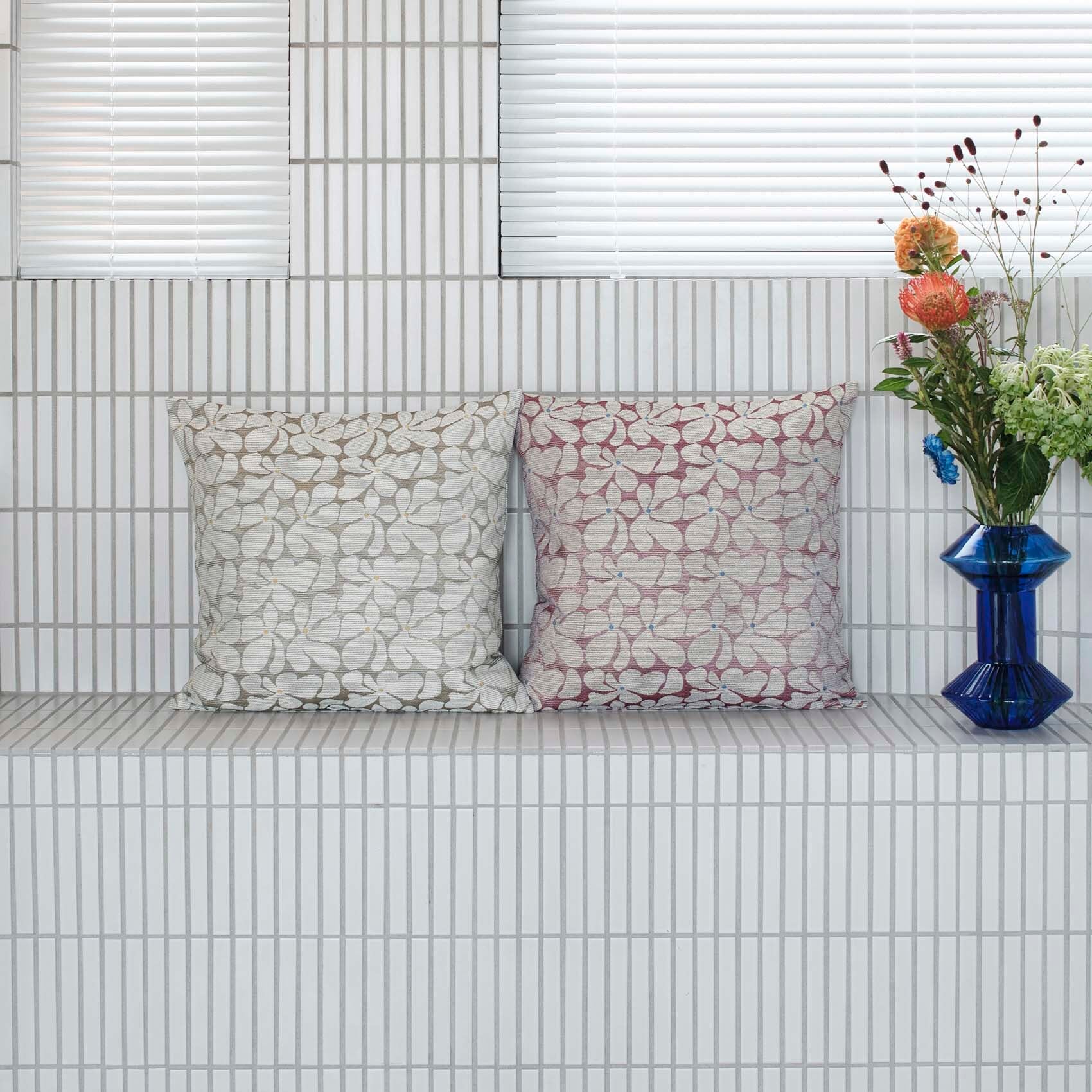 ゆるっとした花のモチーフがタイル状に並んだデザインの「レトロナココチ」をシンプルに縫製してクッションにお仕立てしました。花のモチーフにはコットンに似せてつくったフワフワの糸をたっぷり使ってレトロな雰囲気に。モダンなインテリアや家具に、あたたなムードや抜け感のアクセントを加えてくれるオシャレなデザインとなっています。