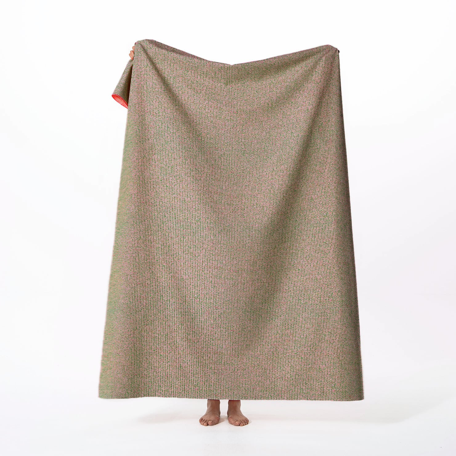 モコモコとした手触りの厚手の無地ファブリックです。シャンブレー織でグリーンがチラ見えする大人っぽいピンク色です。ツイード風の質感がインテリアにトラッドなアクセントを加えます。廃棄される洋服をリサイクルした糸を一部に使っています。