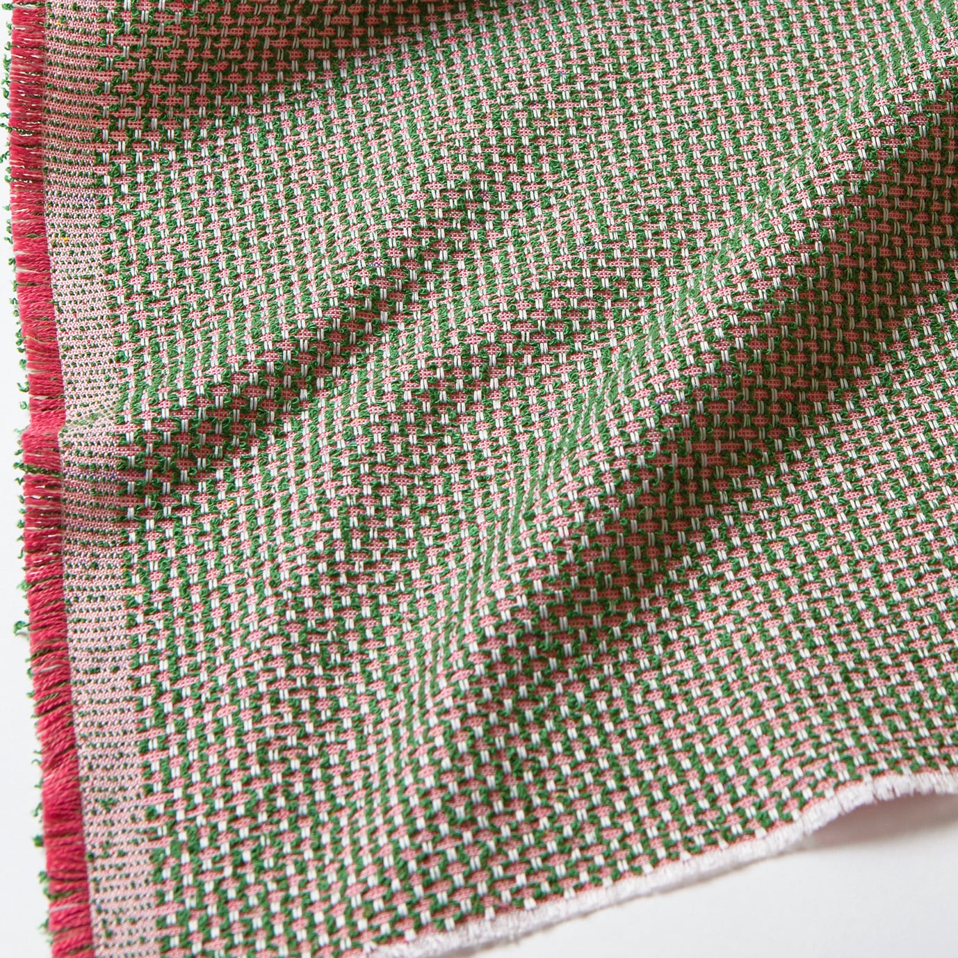 太いくるくるとしたグリーン糸をニットの様にダイヤ型に織った厚みのあるファブリックです。奥に隠れたピンクの糸がカーテンに仕立てると見え隠れしてニュアンスを加えます。廃棄される洋服をリサイクルした糸を一部に使った環境にもやさしいファブリックです。