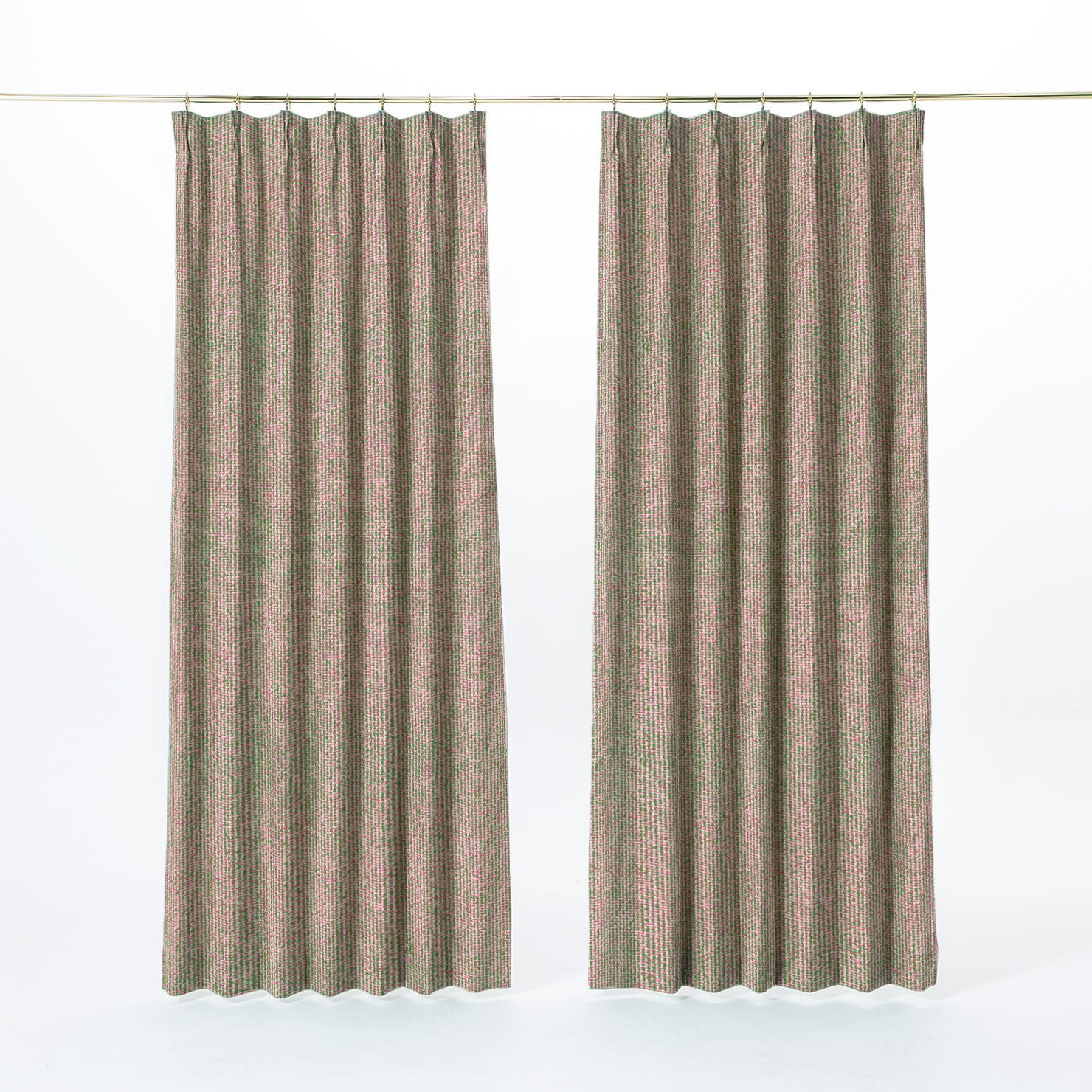 ニットの様なラフな雰囲気のカーテンを目指してモコモコと立体感のあるテキスタイルを設計しました。ツイード風の質感がインテリアにトラッドなアクセントを加えます。あたたかなテクスチャーで保温効果も高いです。シャンブレー織でグリーンがチラ見えする大人っぽいピンク色です。