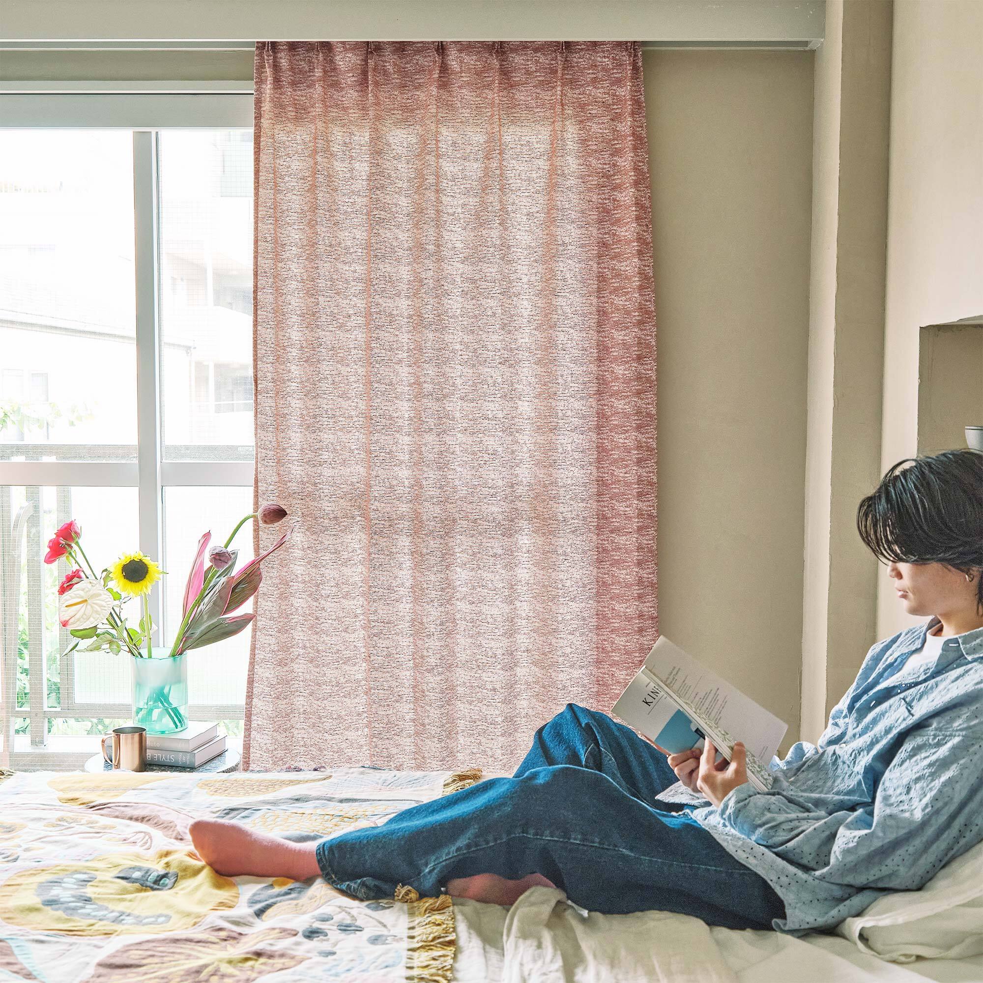やわらかな春の陽気をイメージした無地調のカーテンです。クレヨンで描いたのびやかな線を織物に落とし込みました。キャンバスの上で3色の色糸が混ざり合って紡ぐふんわりとしたニュアンスのある発色が魅力です。心象風景のようなどこか懐かしい雰囲気がお部屋をやわらかく包みます。廃棄される洋服をリサイクルした糸を一部に使ったサスティナブルな一品です。