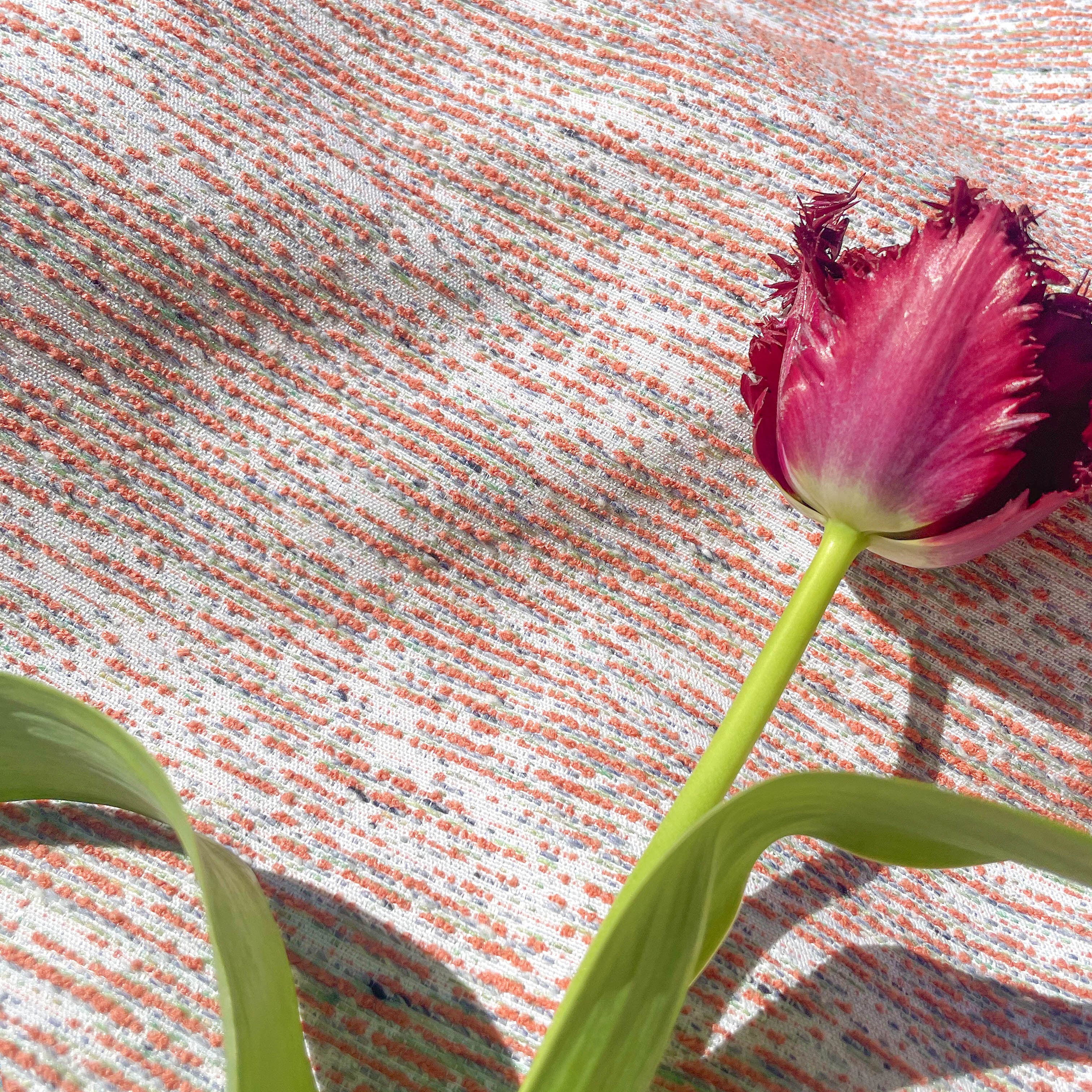 ふわふわした糸やリサイクル糸をベースに縫い留める様にして織った凹凸感のあるファブリックです。コットンやアクリルのあたたかな素材感から手触りがふんわりとしています。どこかノスタルジックで優しい雰囲気です。3色の色を組み合わせる事でニュアンスのあるオレンジ色を作り出しています。