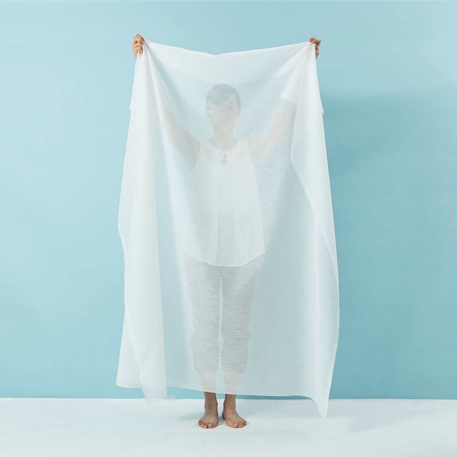 ペットボトルをリサイクルした糸を一部に織り込んだ環境に配慮したレースです。軽やかで使いやすい白いレースです。様々なドレープとコーディネートいただけます。