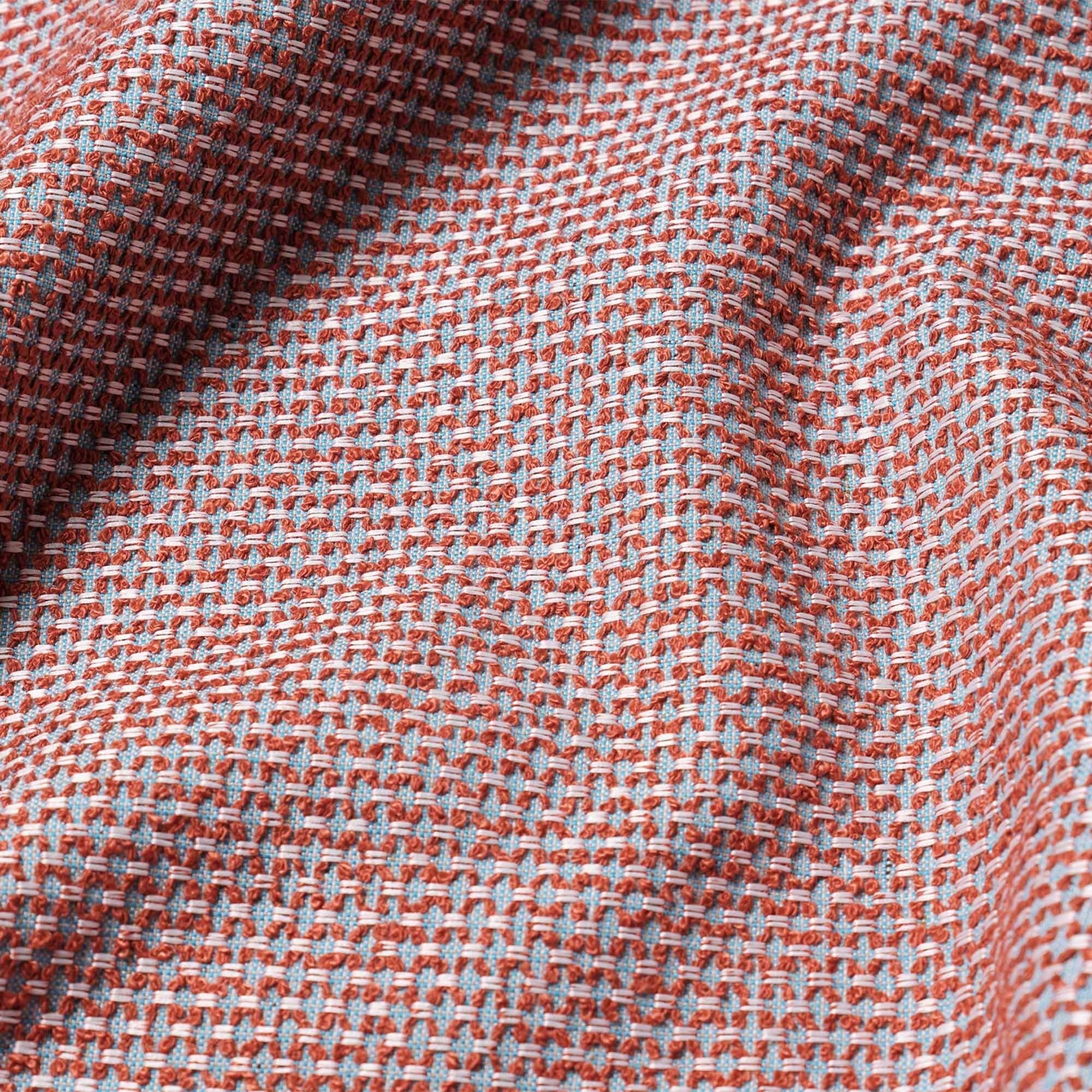 モコモコとした手触りの厚手の無地ファブリックです。シャンブレー織で水色がチラ見えする大人っぽいダークなオレンジ色です。ツイード風の質感がインテリアにトラッドなアクセントを加えます。廃棄される洋服をリサイクルした糸を一部に使っています。