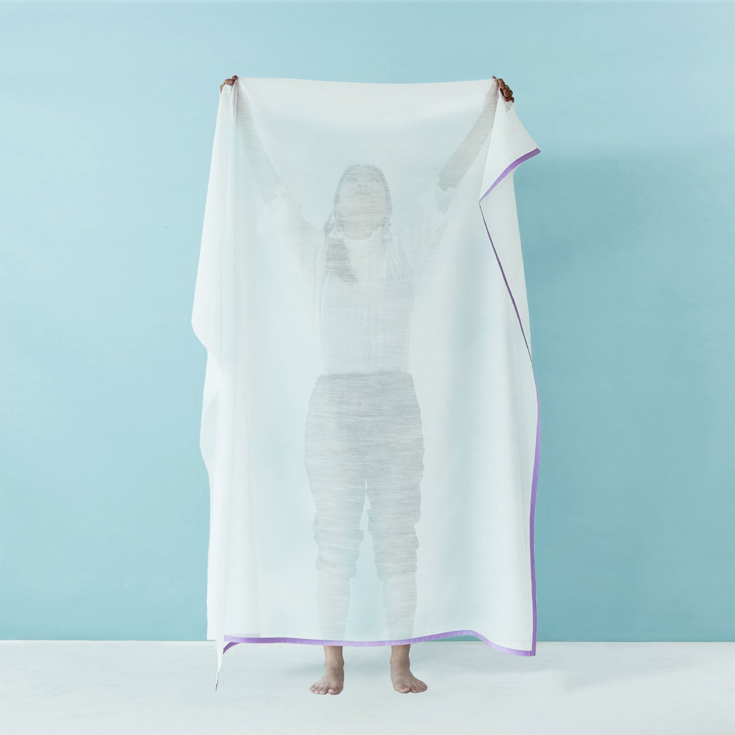 パイピングテープでアクセントを付けたレースです。L字に縫った紫いろのパイピングで窓辺にピリッとしたアクセントが加わります。レース部分はペットボトルをリサイクルした糸を一部に使った環境に配慮した生地を使っています。