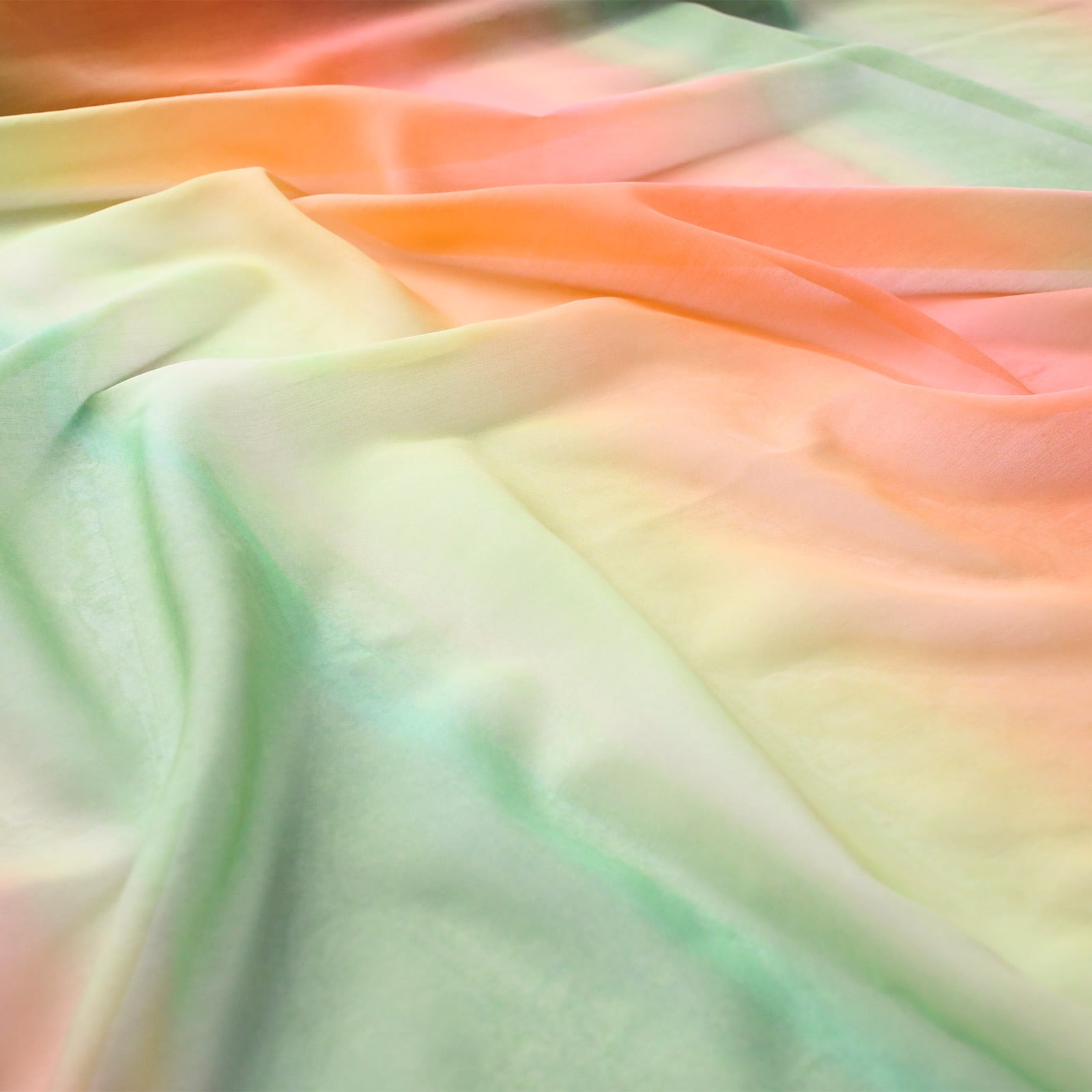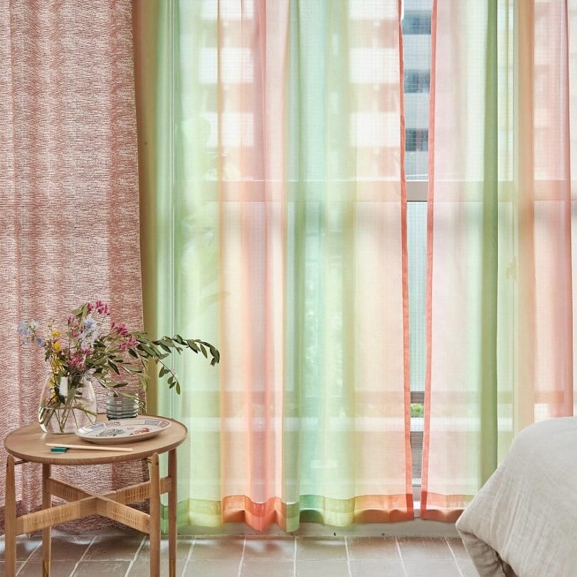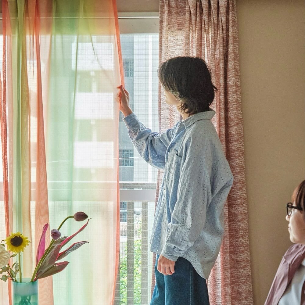 スイカをイメージしたレースです。水彩で描いた75cmの大きなグラデーションを大胆にプリントしました。窓辺を陽気に彩ってくれます。水を使わずに環境に優しくプリントしています。