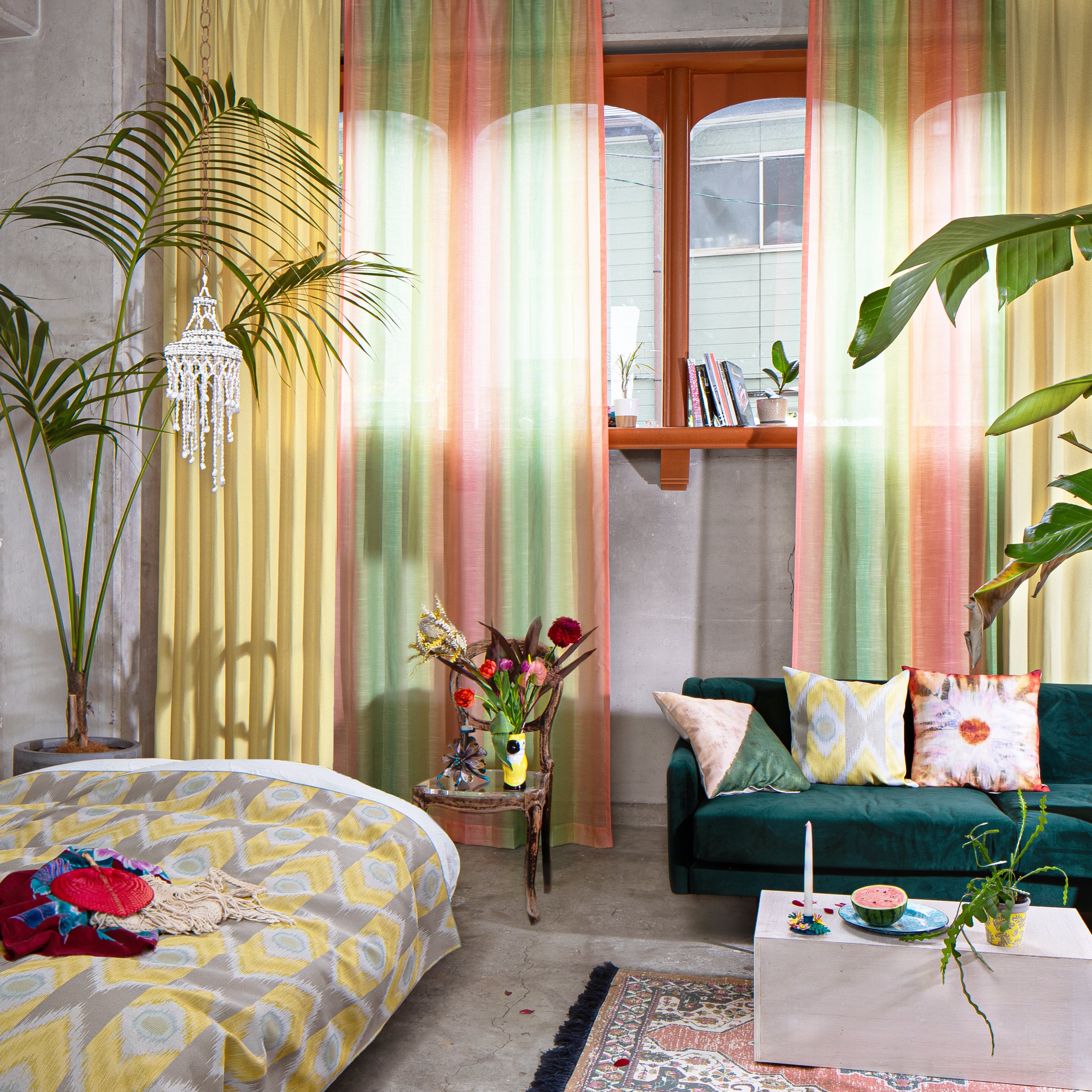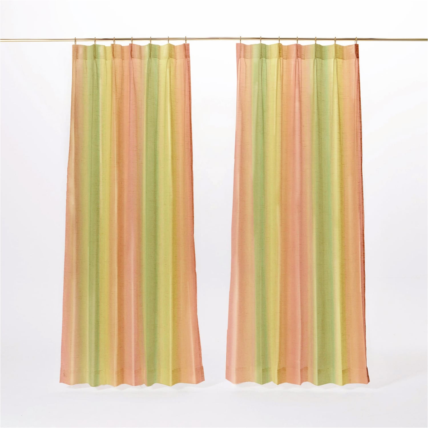 スイカをイメージしたレースです。水彩で描いた75cmの大きなグラデーションを大胆にプリントしました。窓辺を陽気に彩ってくれます。水を使わずに環境に優しくプリントしています。