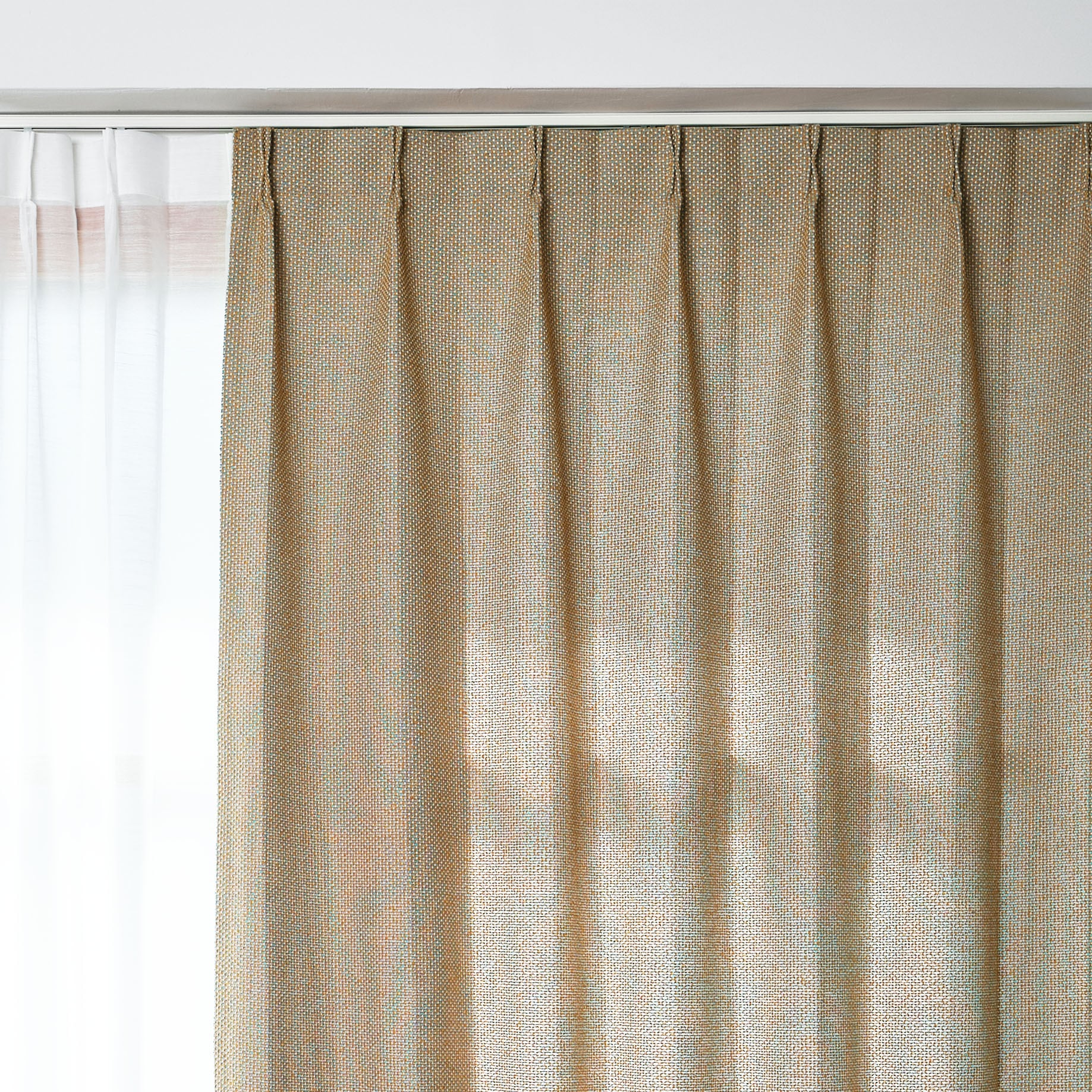 カーテンの上部にはヒダをとっています。ヒダを取ることで生地が波打ち床にストンと落ちてきれいなドレープが生まれます。生地のデザインや質感を楽しめる様に1.5倍の生地を使った大げさすぎないシンプルなお仕立てです。またヒダによる生地の重なりによって外からの視線を遮る効果も高まります。