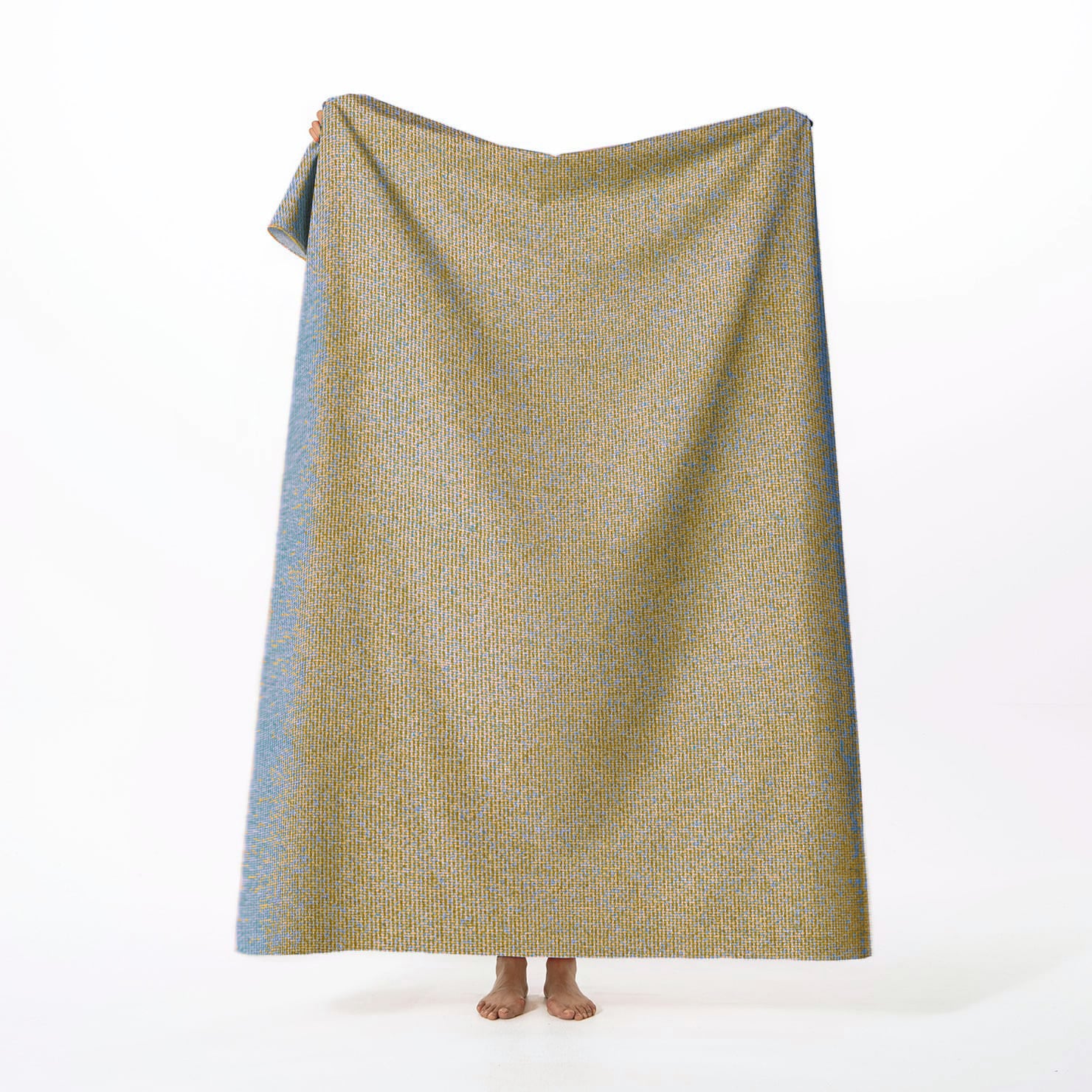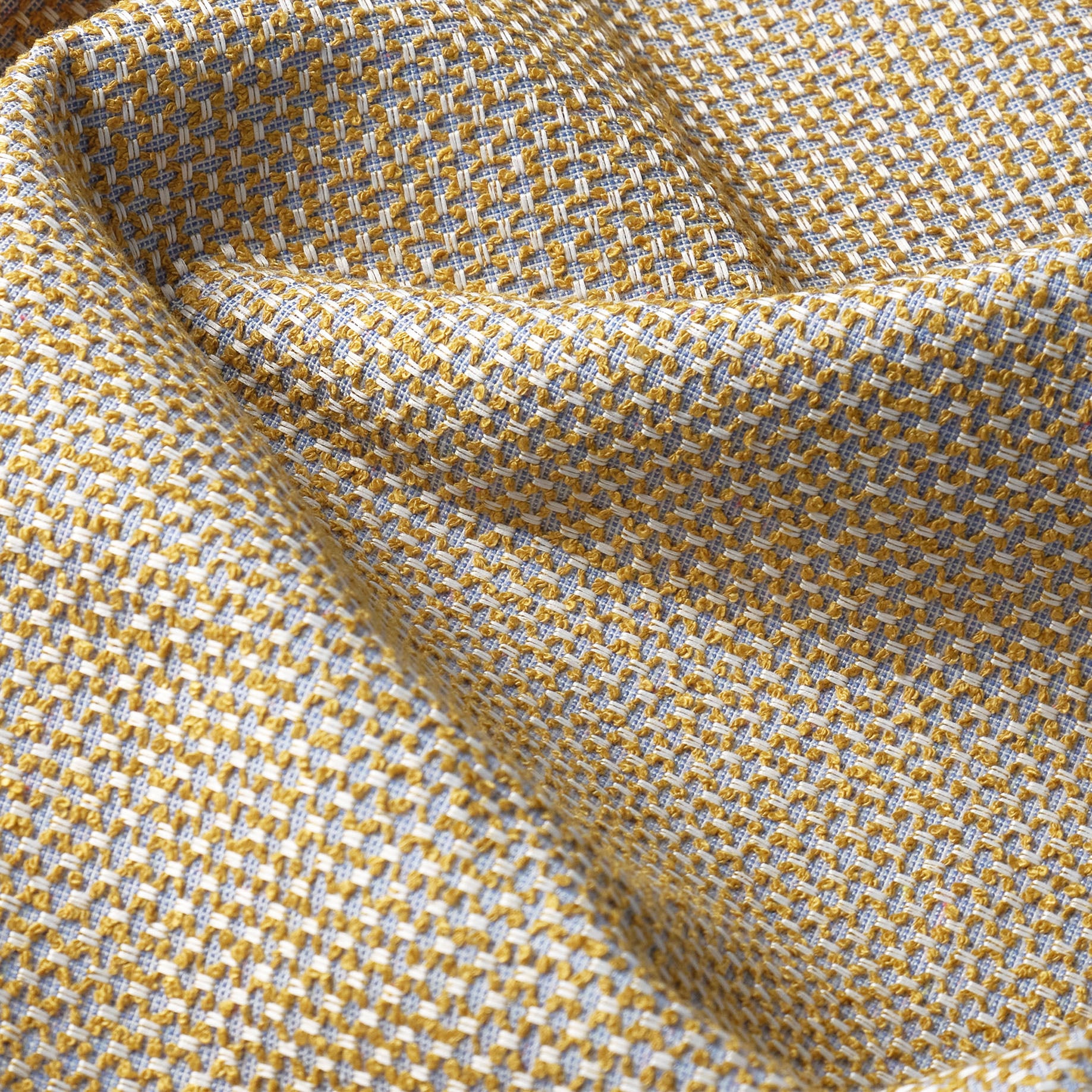モコモコとした手触りの厚手の無地ファブリックです。シャンブレー織でブルーがチラ見えする大人っぽいイエロー色です。ツイード風の質感がインテリアにトラッドなアクセントを加えます。廃棄される洋服をリサイクルした糸を一部に使っています。