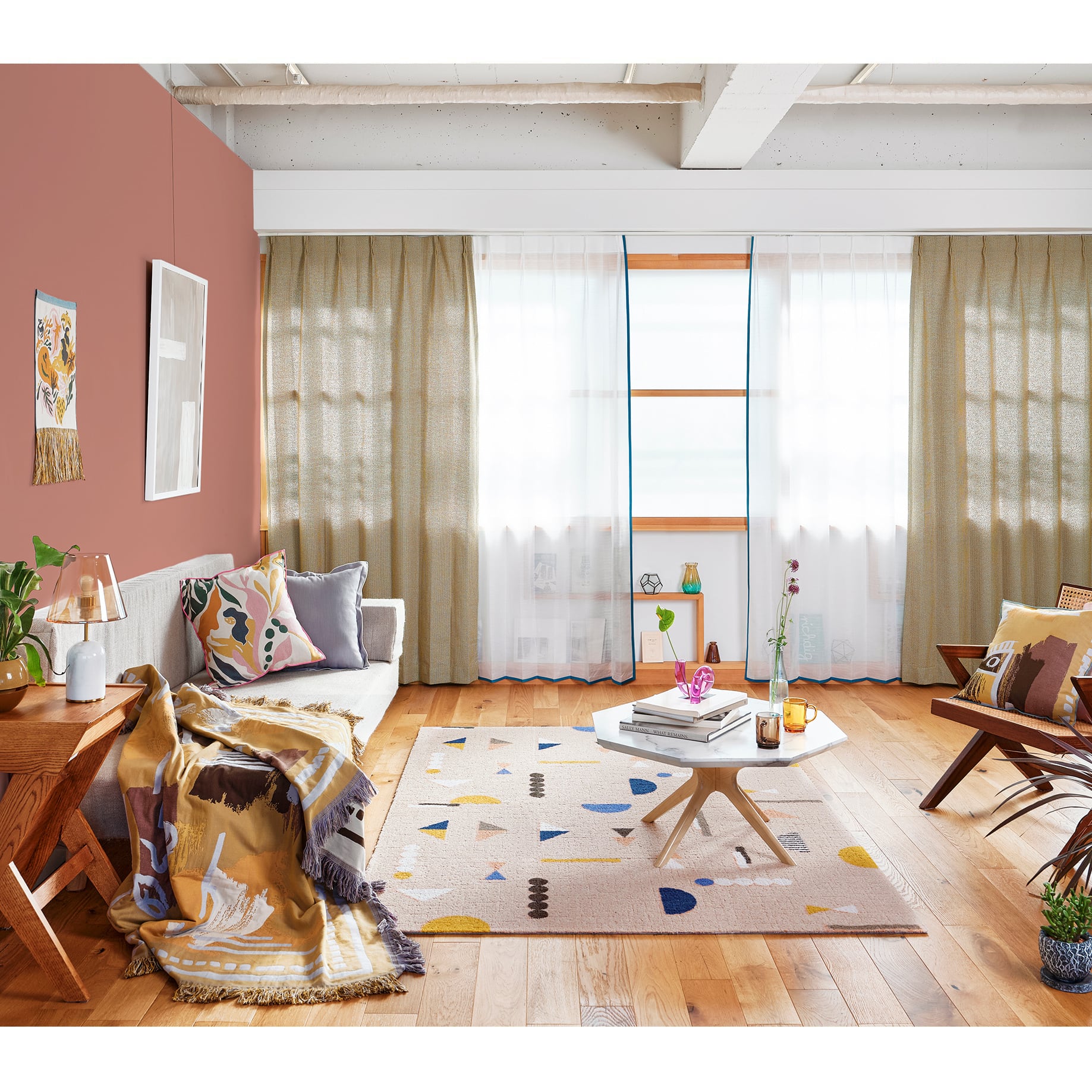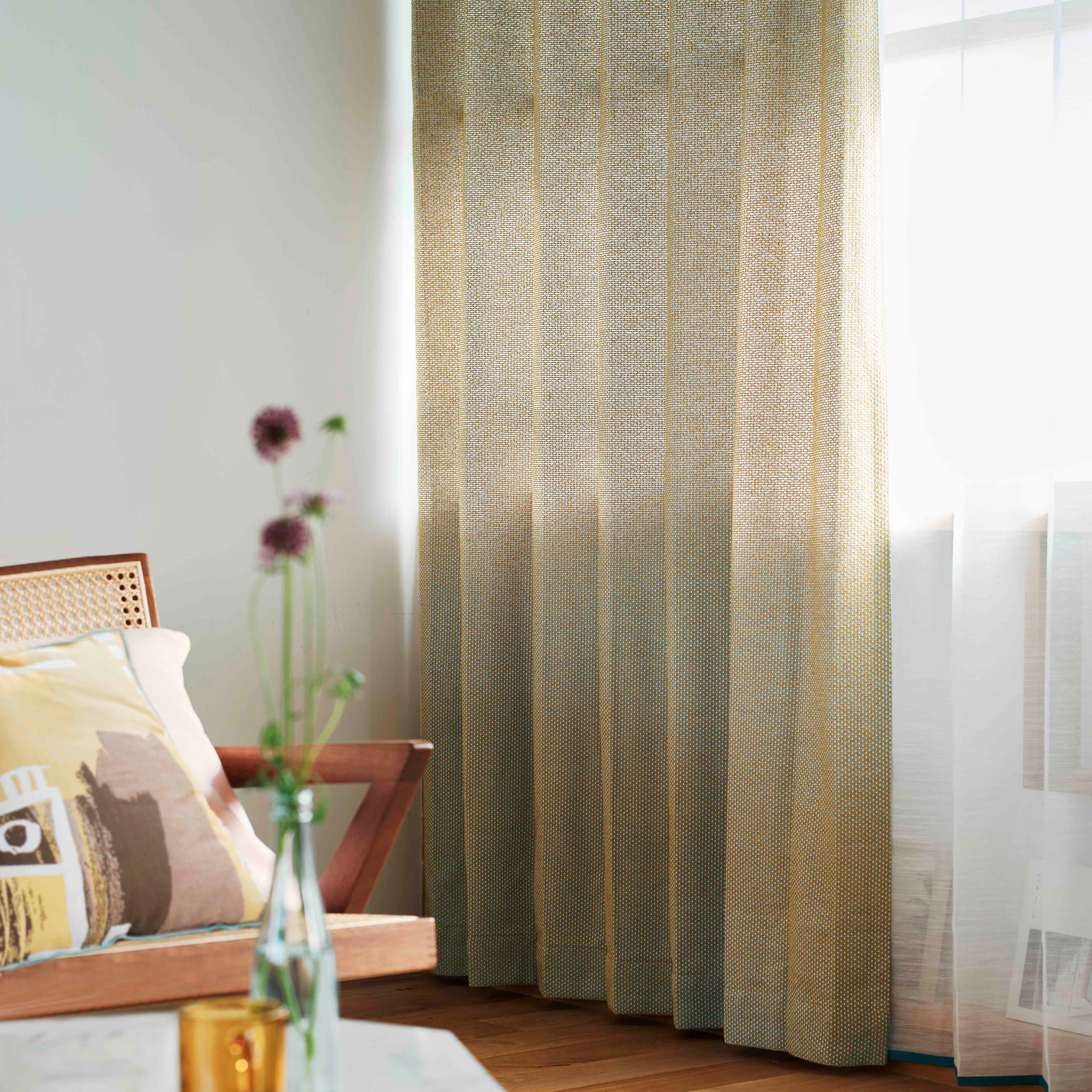 ニットの様なラフな雰囲気のカーテンを目指してモコモコと立体感のあるテキスタイルを設計しました。ツイード風の質感がインテリアにトラッドなアクセントを加えます。あたたかなテクスチャーで保温効果も高いです。人気ファブリックにレトロなイエロー色が加わりました。