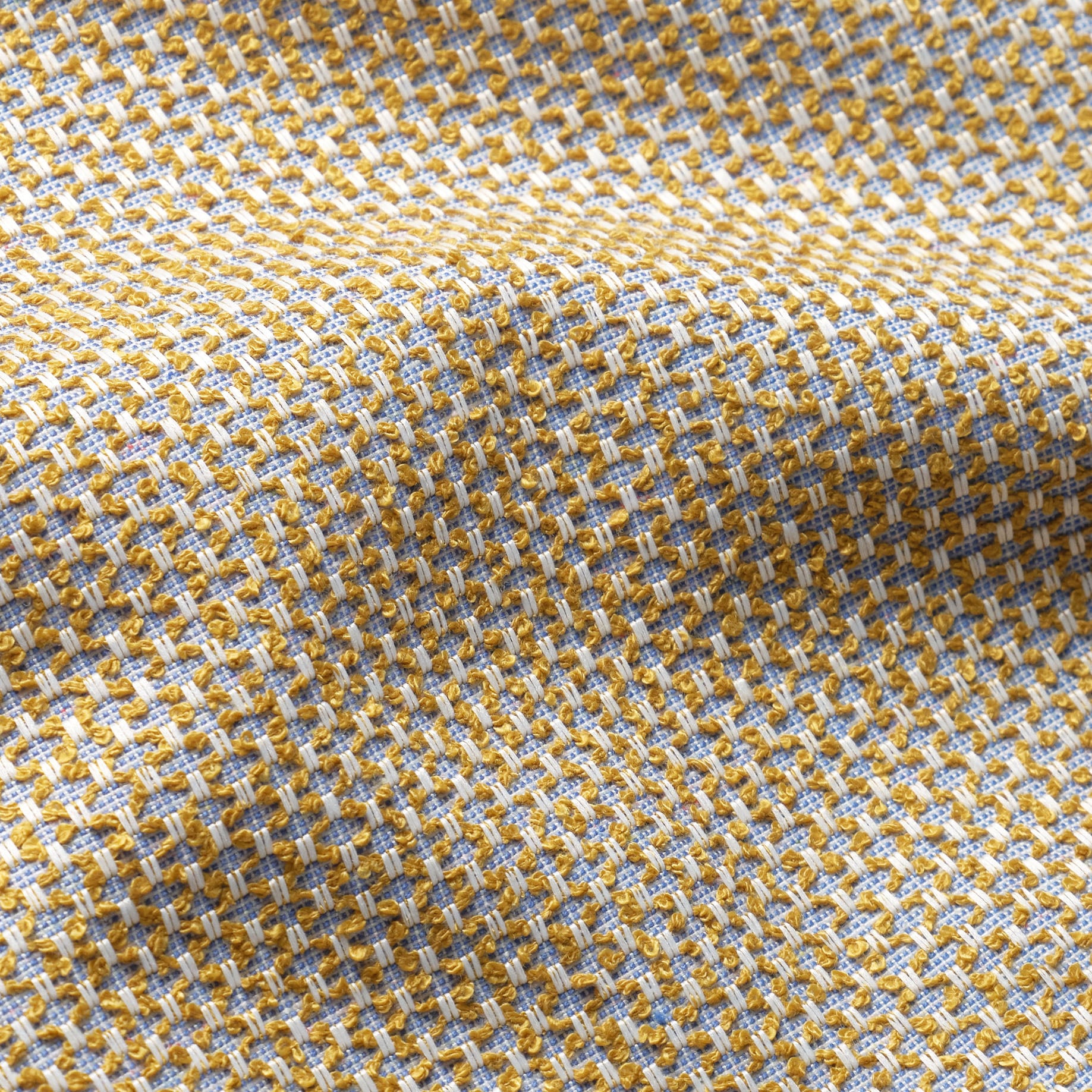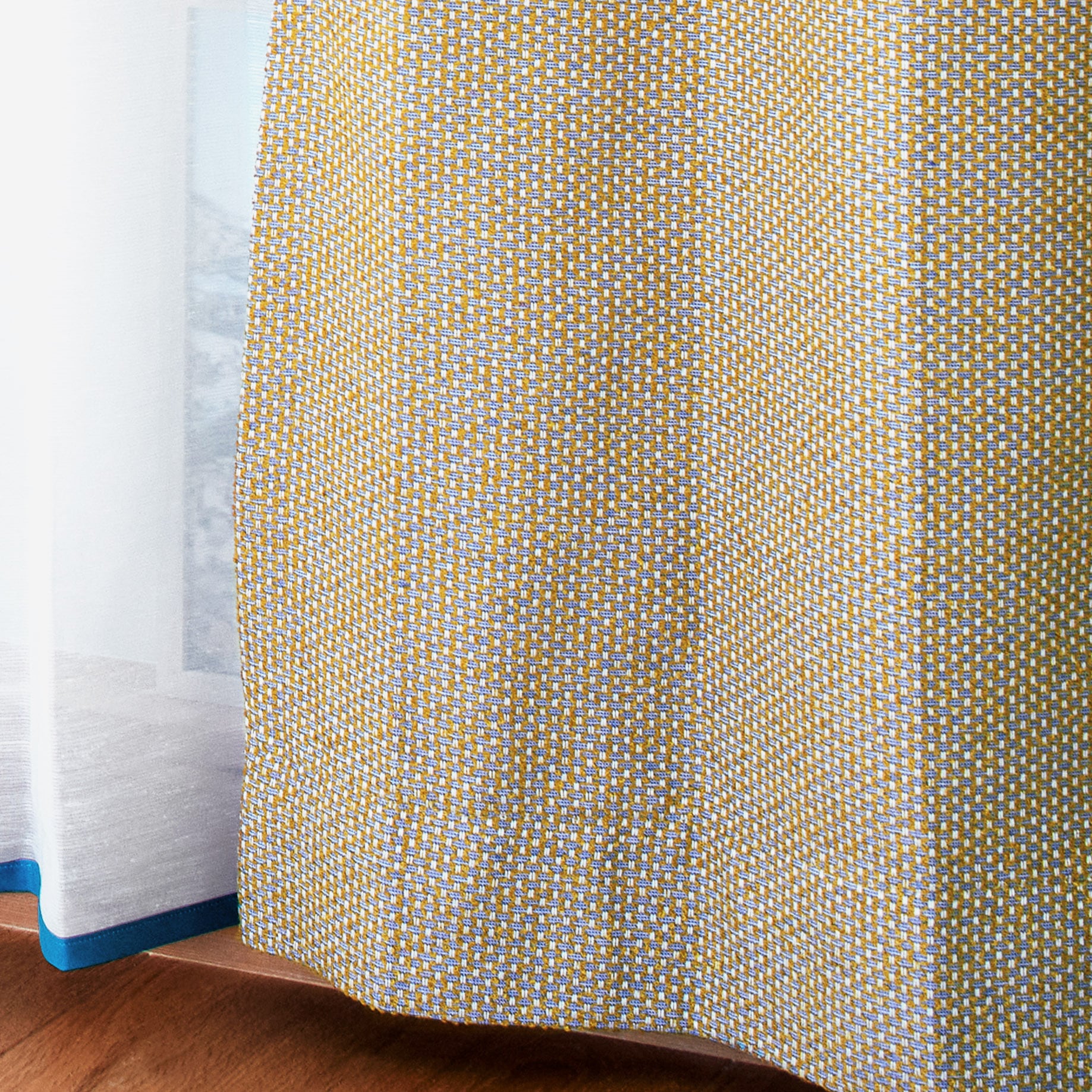 太いくるくるとしたイエローの糸をニットの様にダイヤ型に織った厚みのあるファブリックです。奥に隠れたスカイブルーの糸がカーテンに仕立てると見え隠れしてニュアンスを加えます。廃棄される洋服をリサイクルした糸を一部に使った環境にもやさしいファブリックです。