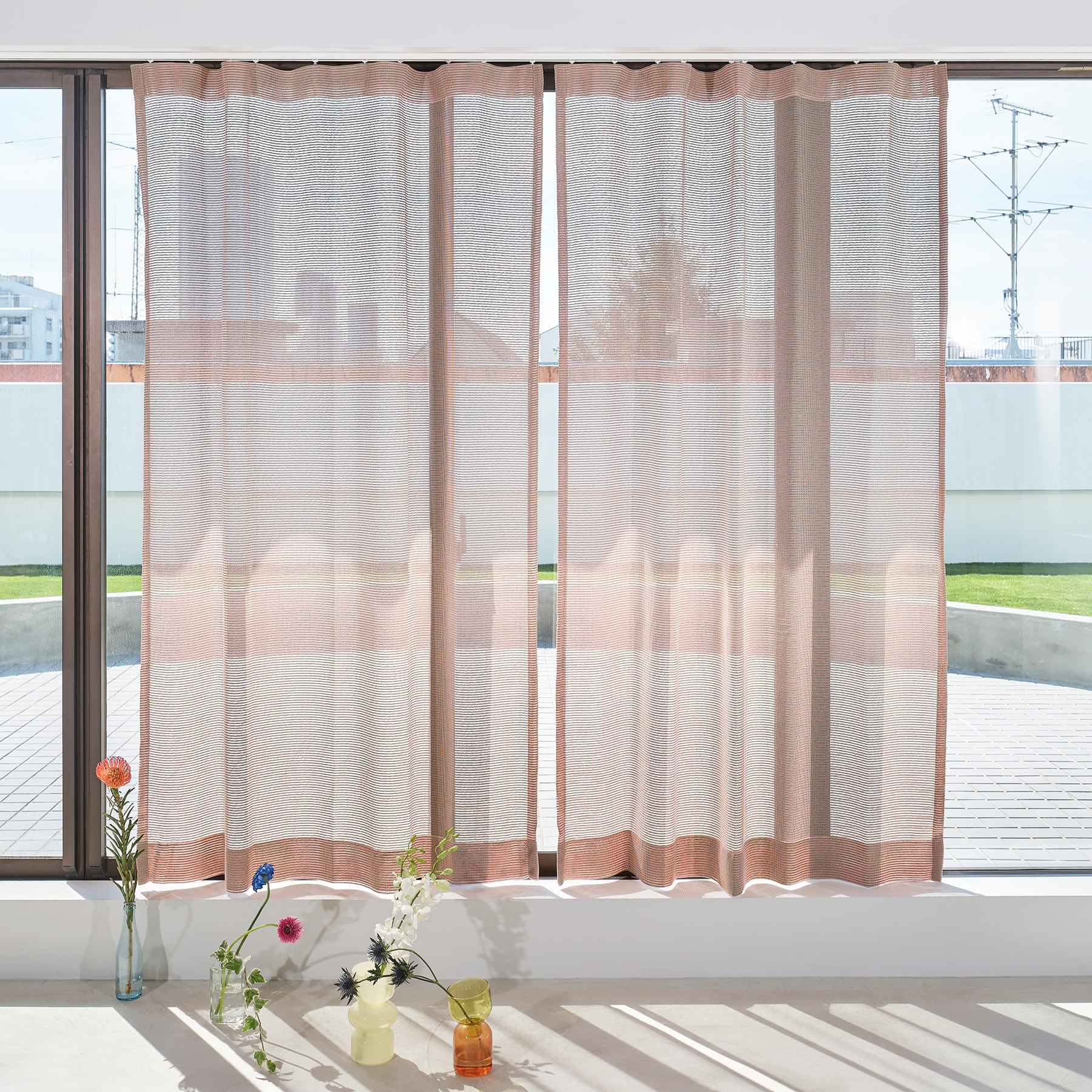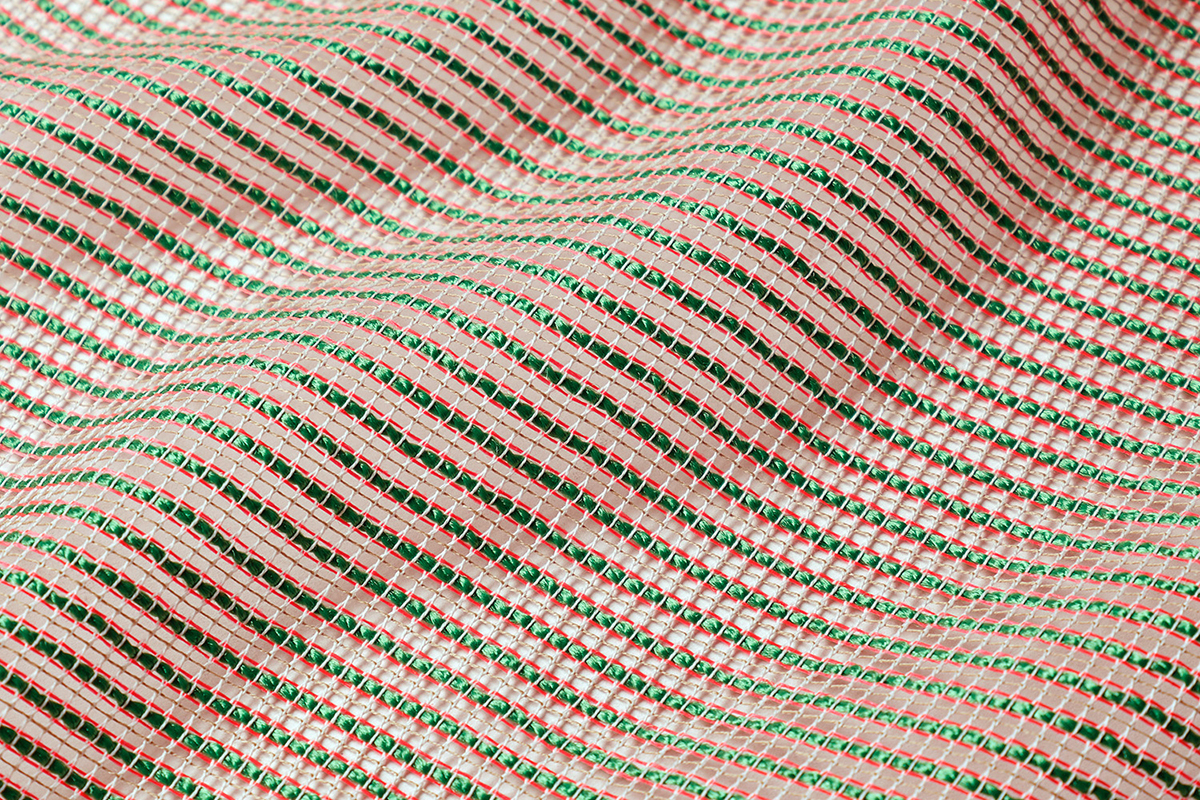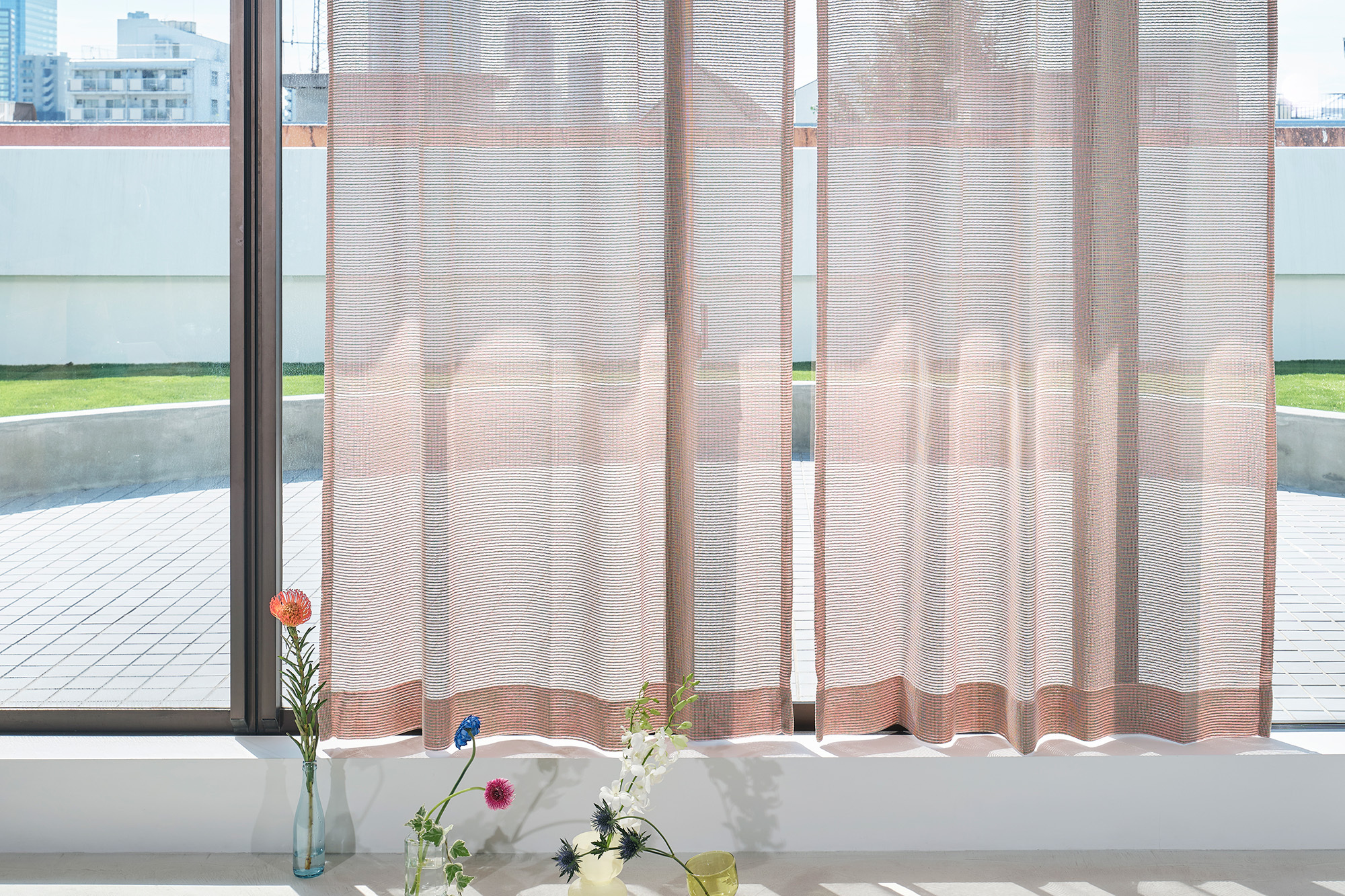 太い糸はトウモロコシ由来のサスティナブルな再生糸。トウモロコシの粒の並びをイメージして整然と色糸を並べることで、ざっくりしつつもモダンなデザインに仕上げました。さわやかな色の組み合わせが窓辺を軽やかな印象にしつつも、カラミ織独特の透け感によってモダンな空間にしてくれる、他にはない特別なファブリックとなっています。