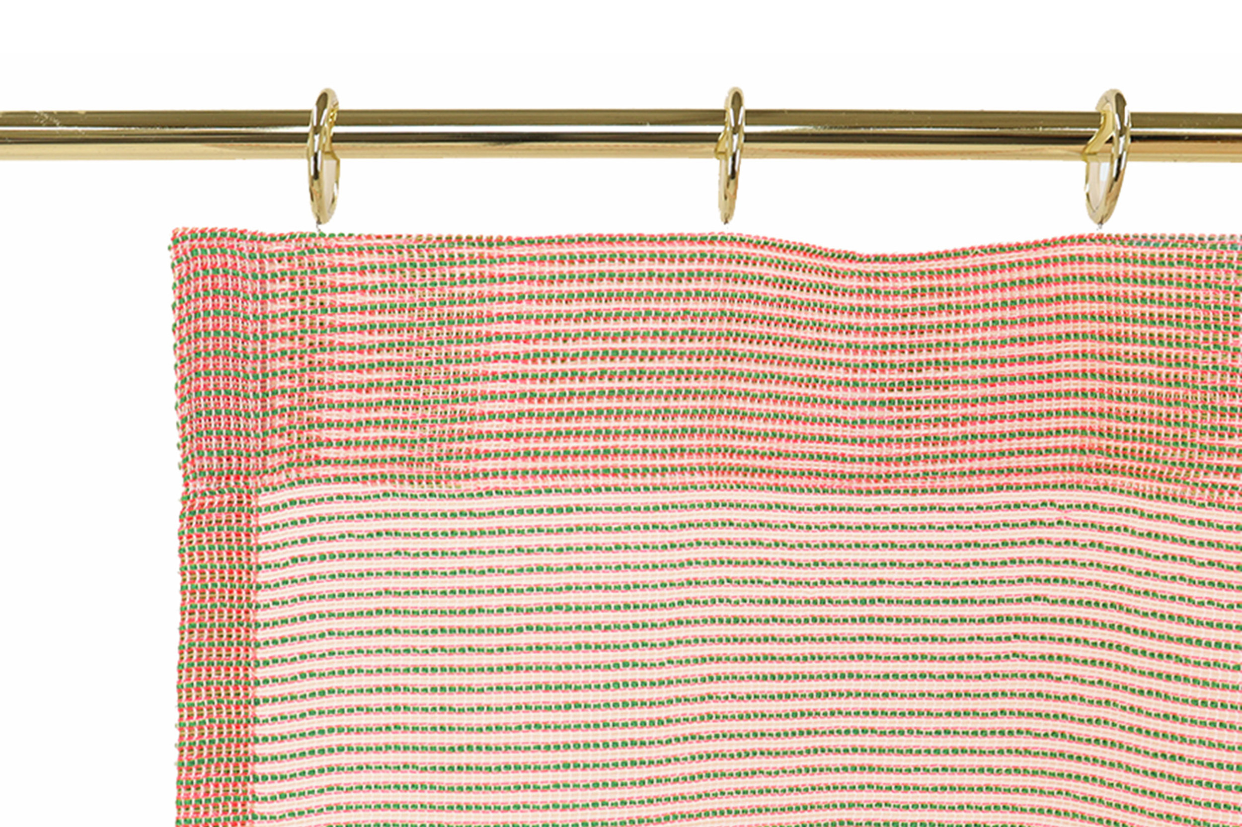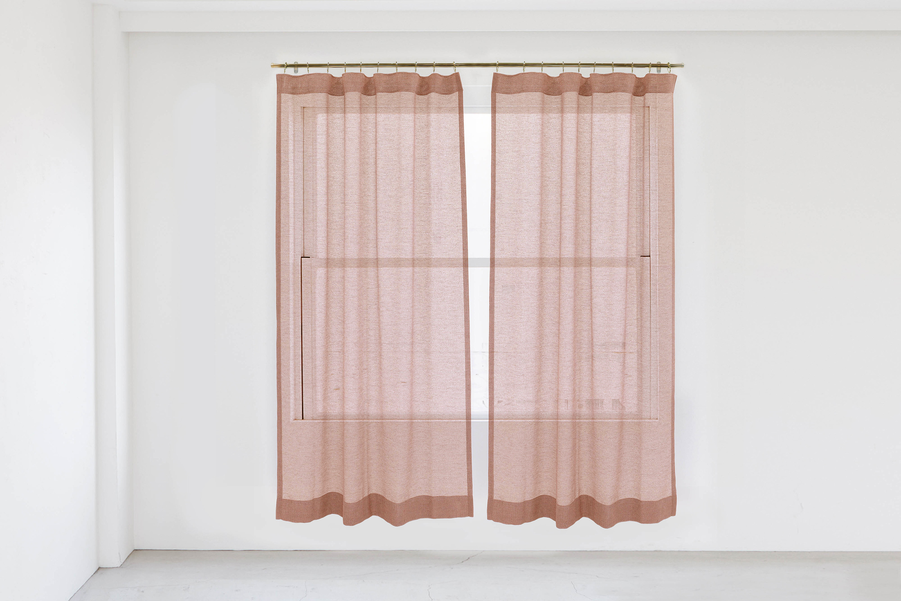 フラットカーテンはレール幅と同一サイズで作るとピチピチと窓に張り付いたような印象になってしまうため、Roughでは通常は100cm幅2枚ですが「カラミ"トウモロコシ"」では125cm幅2枚でお届けします。レールに余裕をもって取り付けれるサイズ感です。