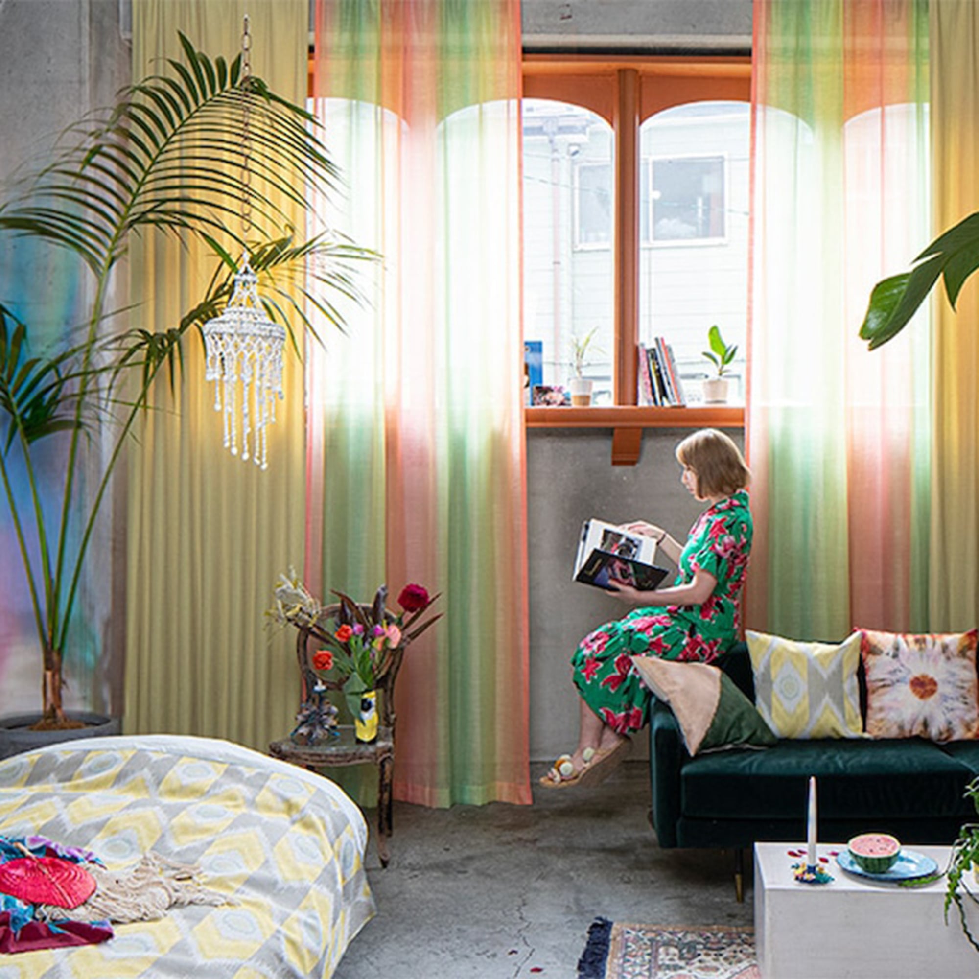 カラフルで陽気なムードを窓辺から楽しめる、RoughオリジナルのカーテンSET。スイカをイメージした大胆なグラデーションレースに、しっかりと厚みのある明るいイエローのドレープを合わせました。飾るだけでお部屋にエネルギーが生まれ、毎日を前向きな気分にしてくれるコーディネートです。
