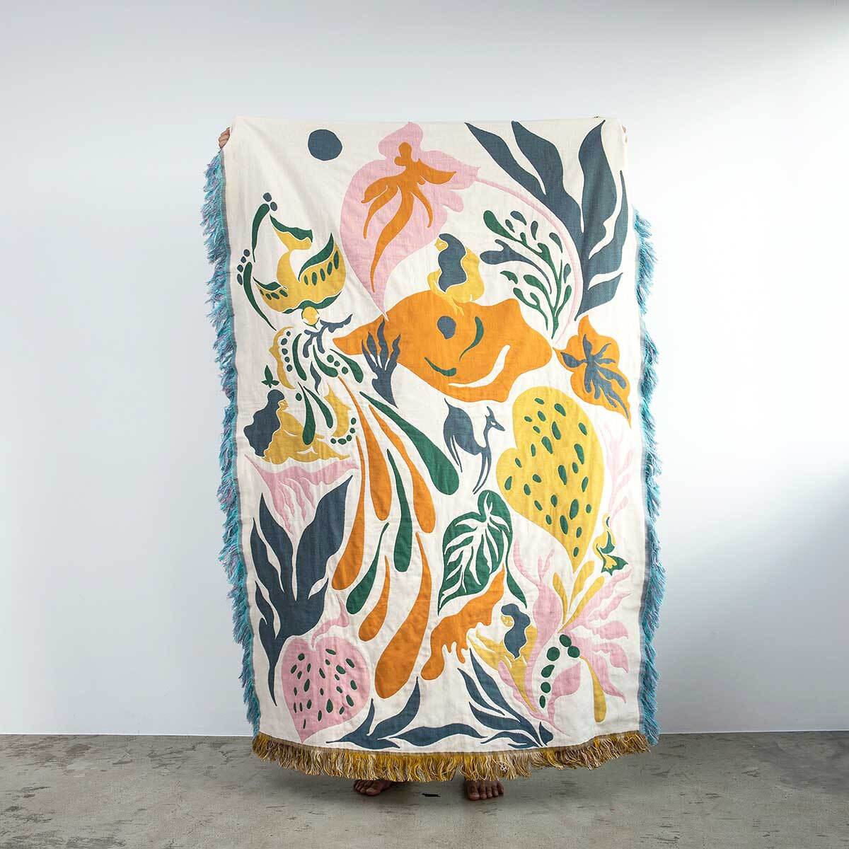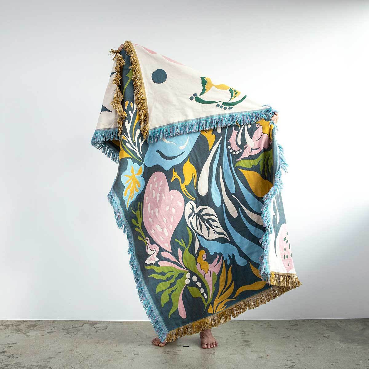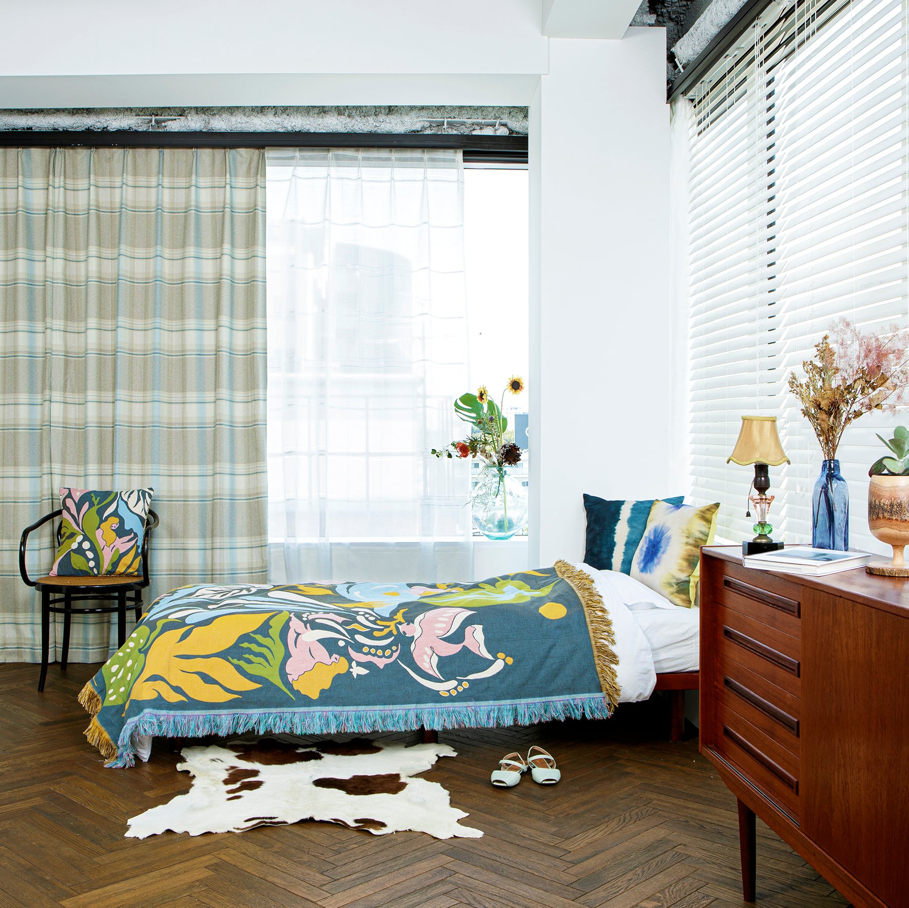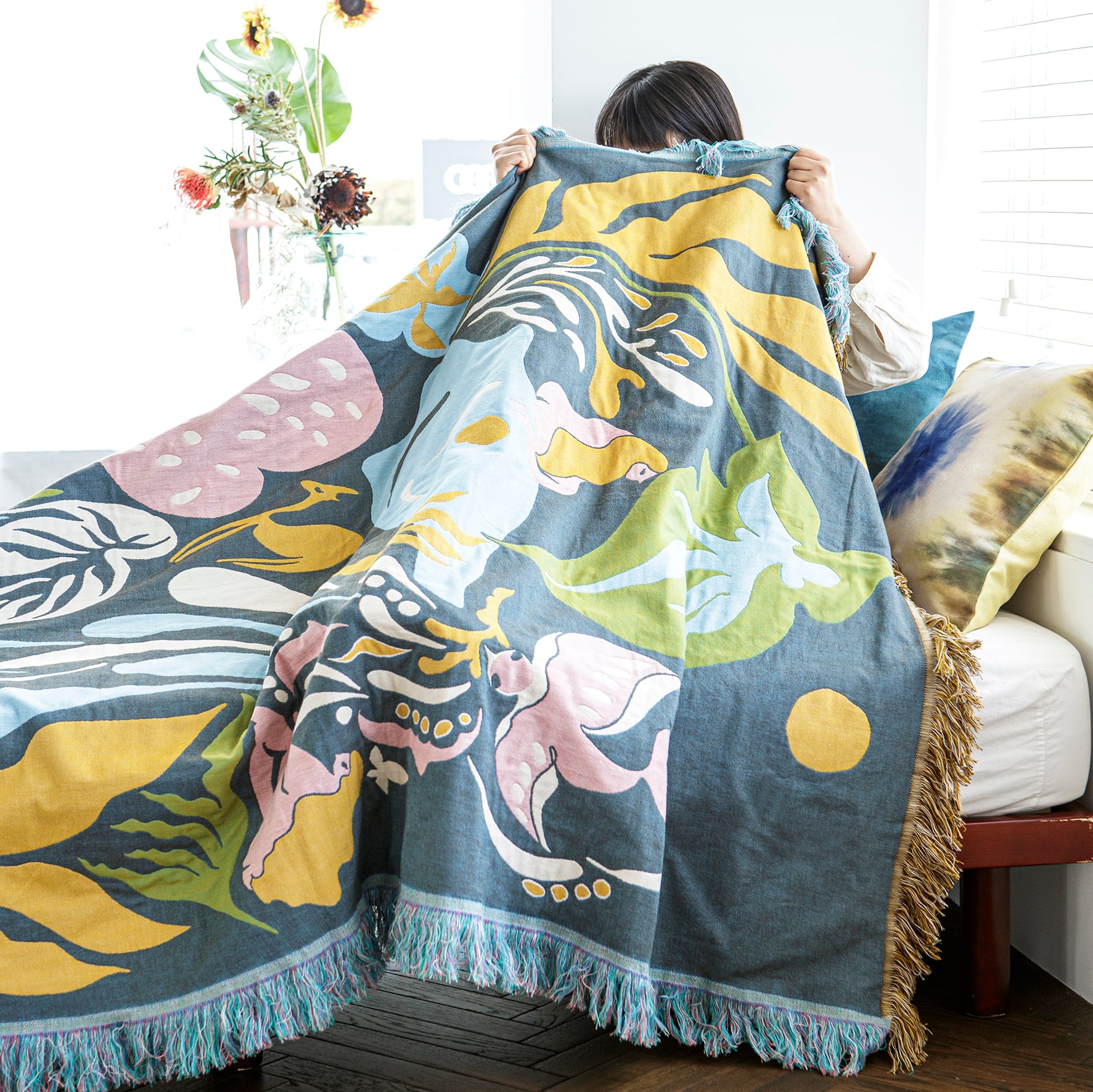 それぞれのブランケットには「物語」があります。ファブリックでお部屋に気軽にアートを取り入れて暮らしが楽しくなる事をイメージしてデザインを考えています。