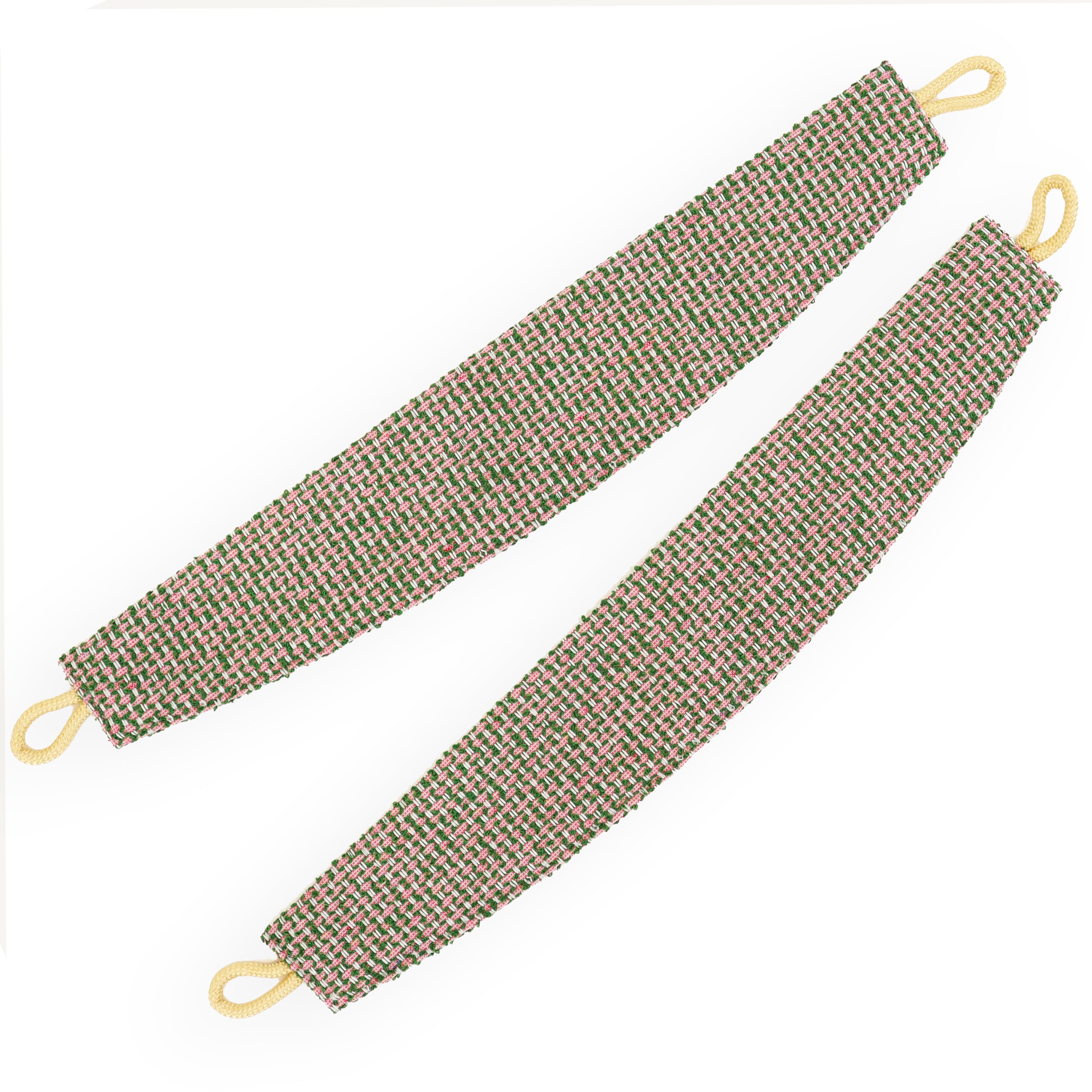 太いくるくるとしたグリーン糸をニットの様にダイヤ型に織った厚みのあるファブリックです。奥に隠れたピンクの糸がカーテンに仕立てると見え隠れしてニュアンスを加えます。廃棄される洋服をリサイクルした糸を一部に使った環境にもやさしいファブリックです。