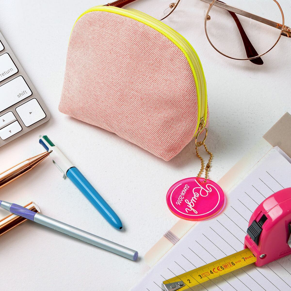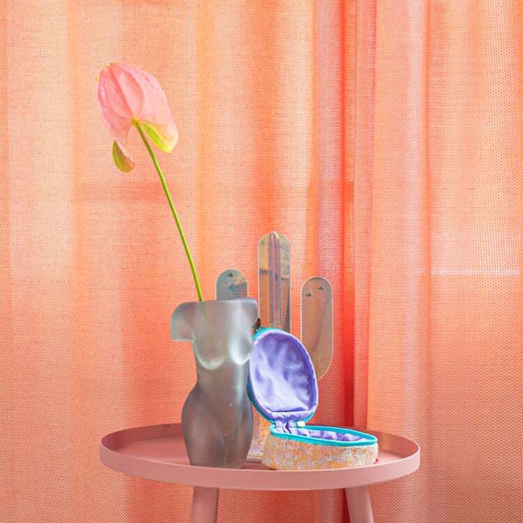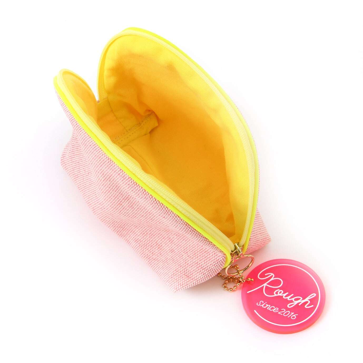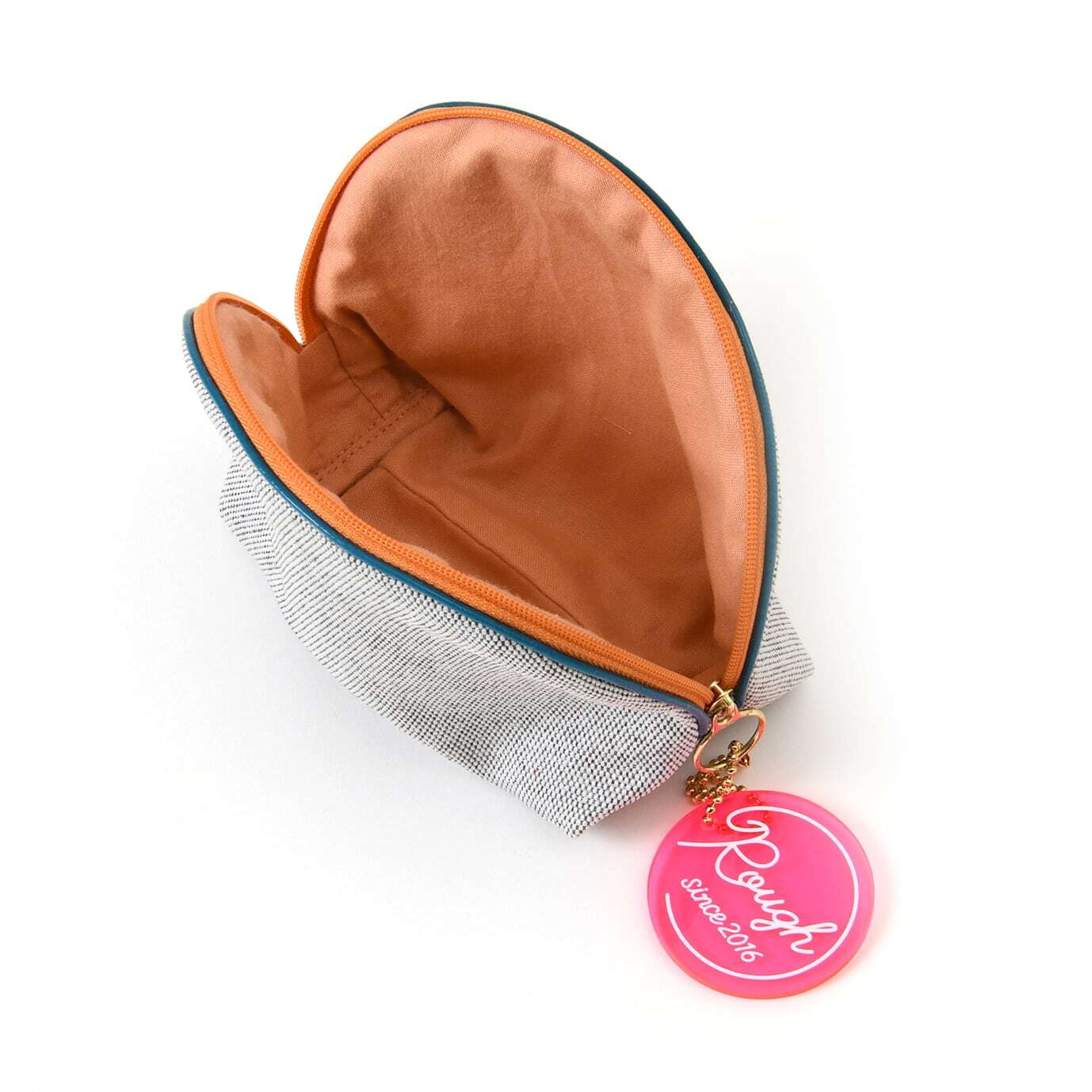 外側と内側で生地の色がガラッと変り使うたびに楽しくなる様なデザインになっています。ファスナーが大きく開くので中身が見えやすく、ファスナーの持ち手も大きく丸い為、開閉がしやすい作りになっています。マチがしっかりあるので収納力も抜群で、自立するタイプなので中身が整理しやすいのも特徴です。