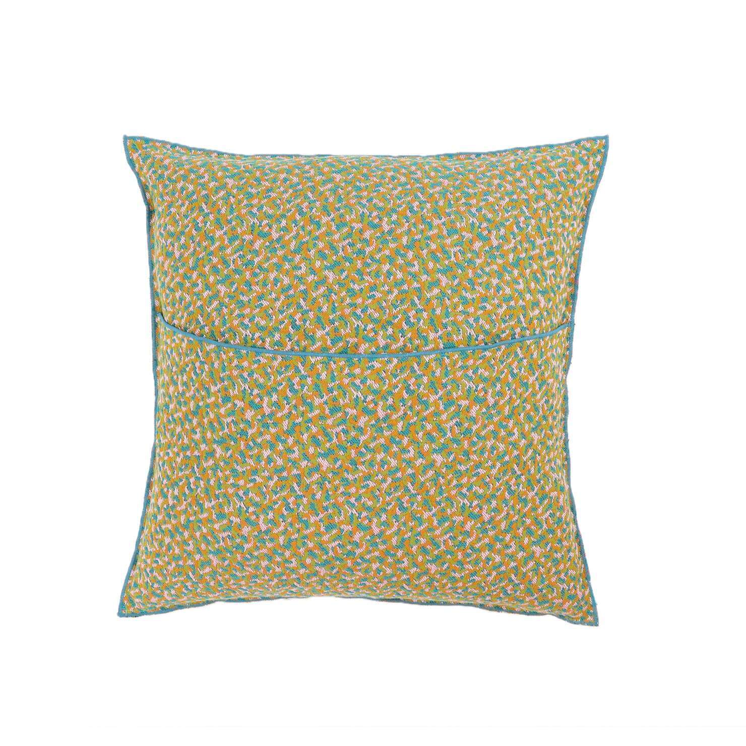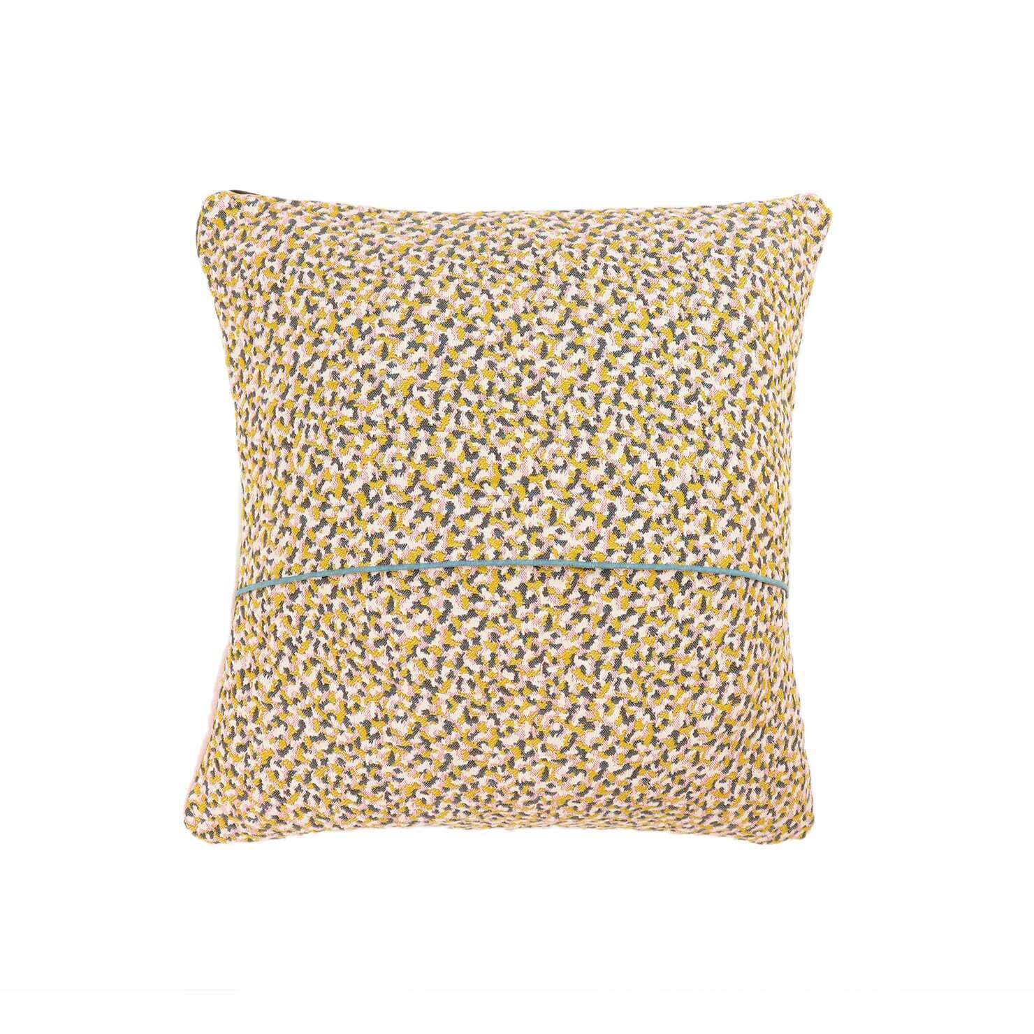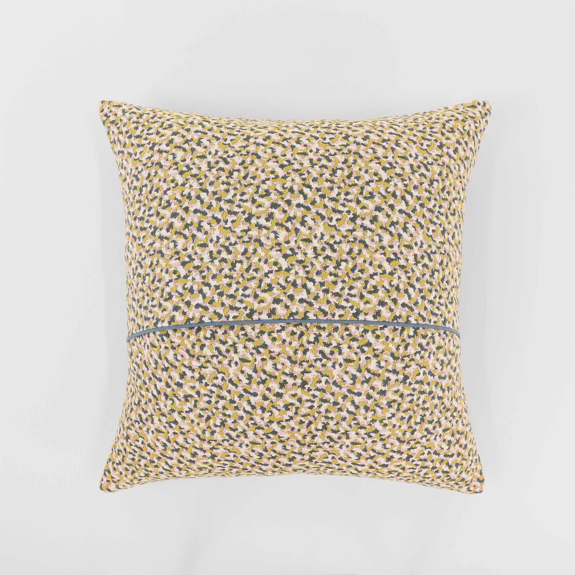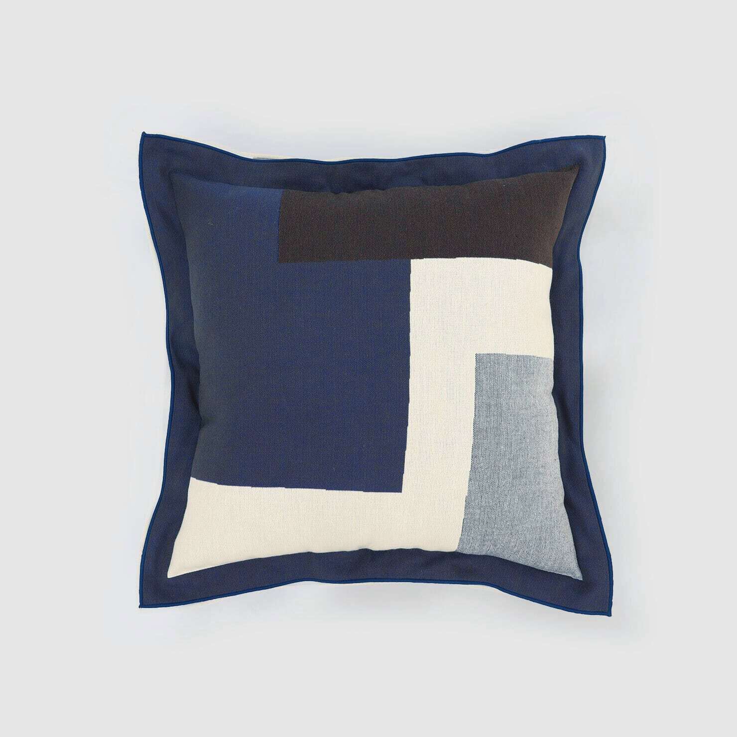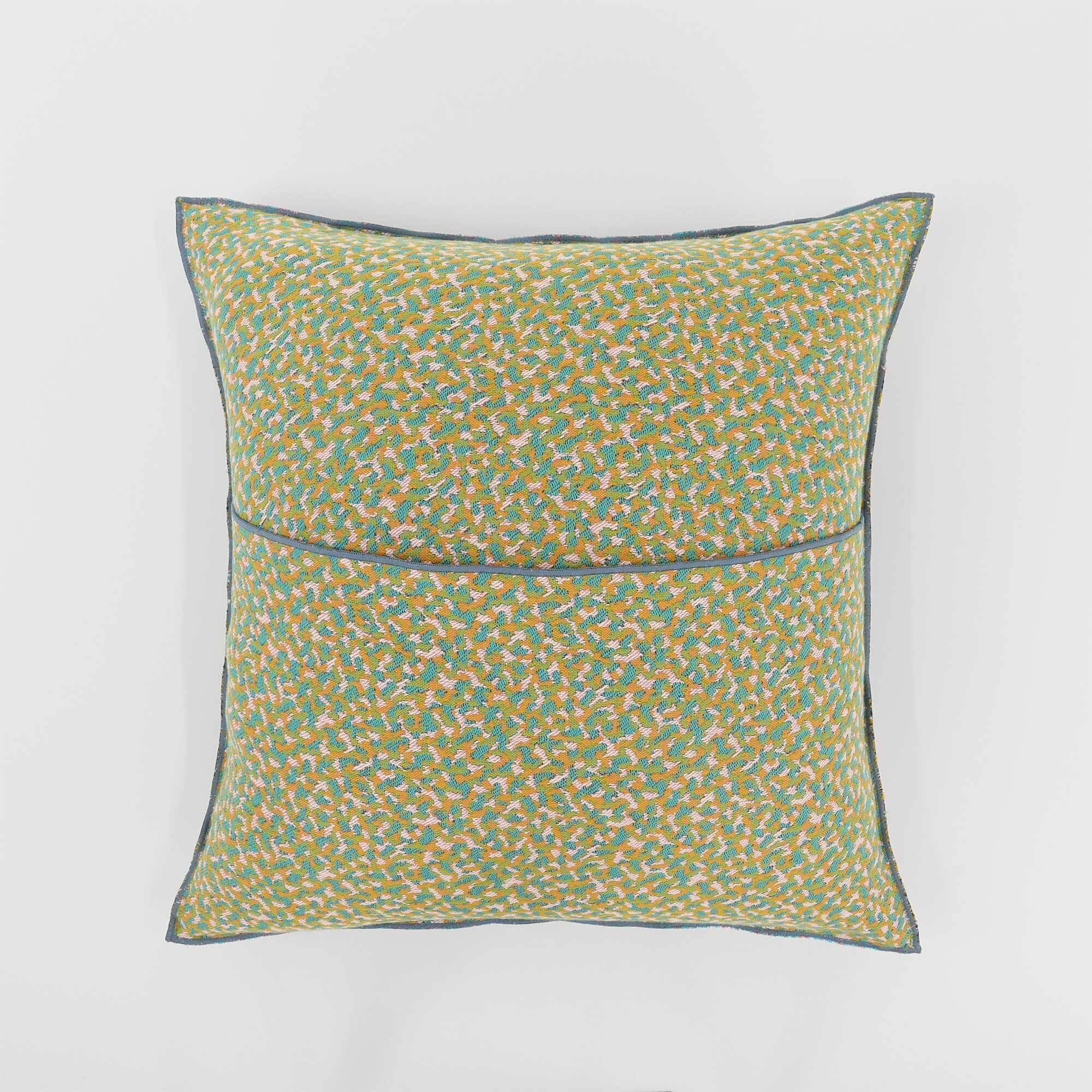 タテ糸とヨコ糸の色糸が織られることで描かれた四角が重なったシンプルなデザインです。コットン100%のやわらかな質感も魅力です。45x45cmのクッションの周囲にマチがの付いたラフなデザインです。環境に配慮しながら自社工場で大切に生産しています。