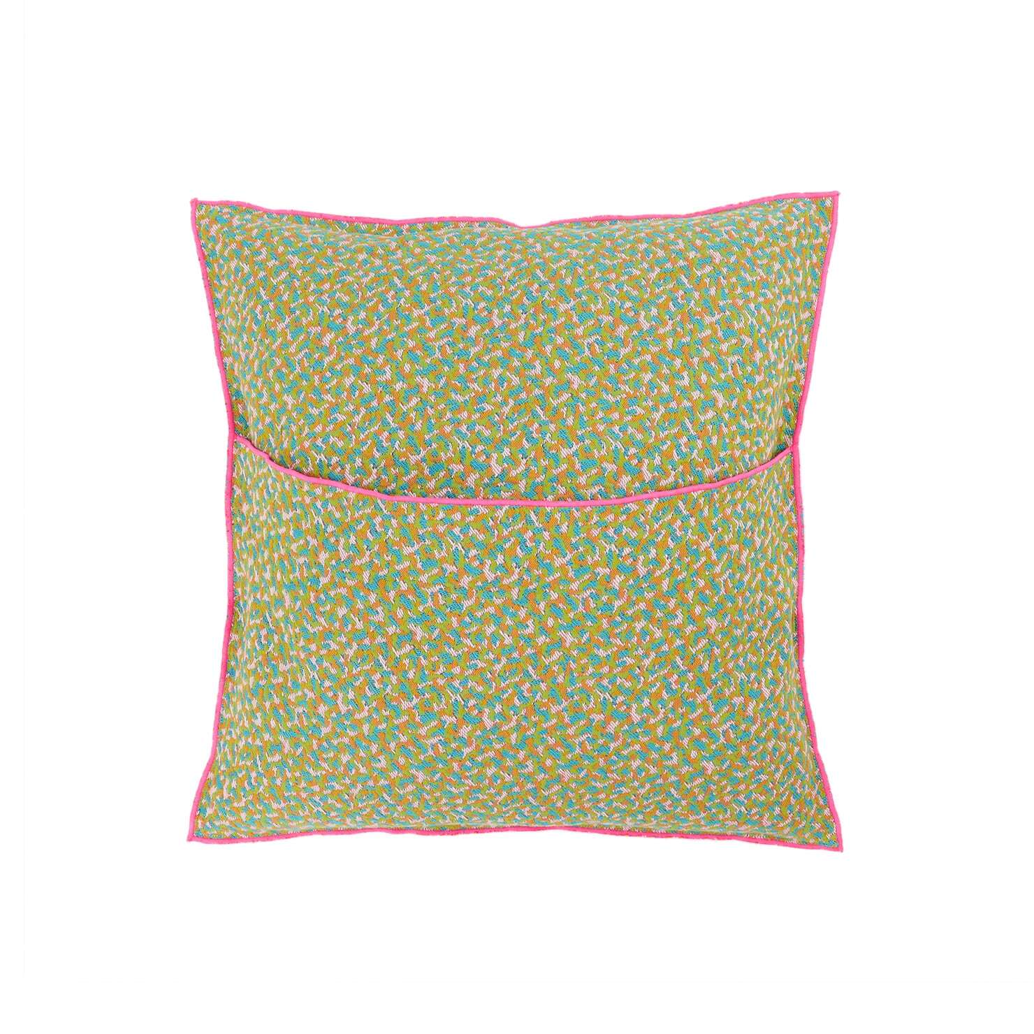 コットン100%のやわらかな質感も魅力です。45x45cmのクッションの周囲にマチがの付いたラフなデザインです。環境に配慮しながら京都にある自社工場で大切に生産しています。