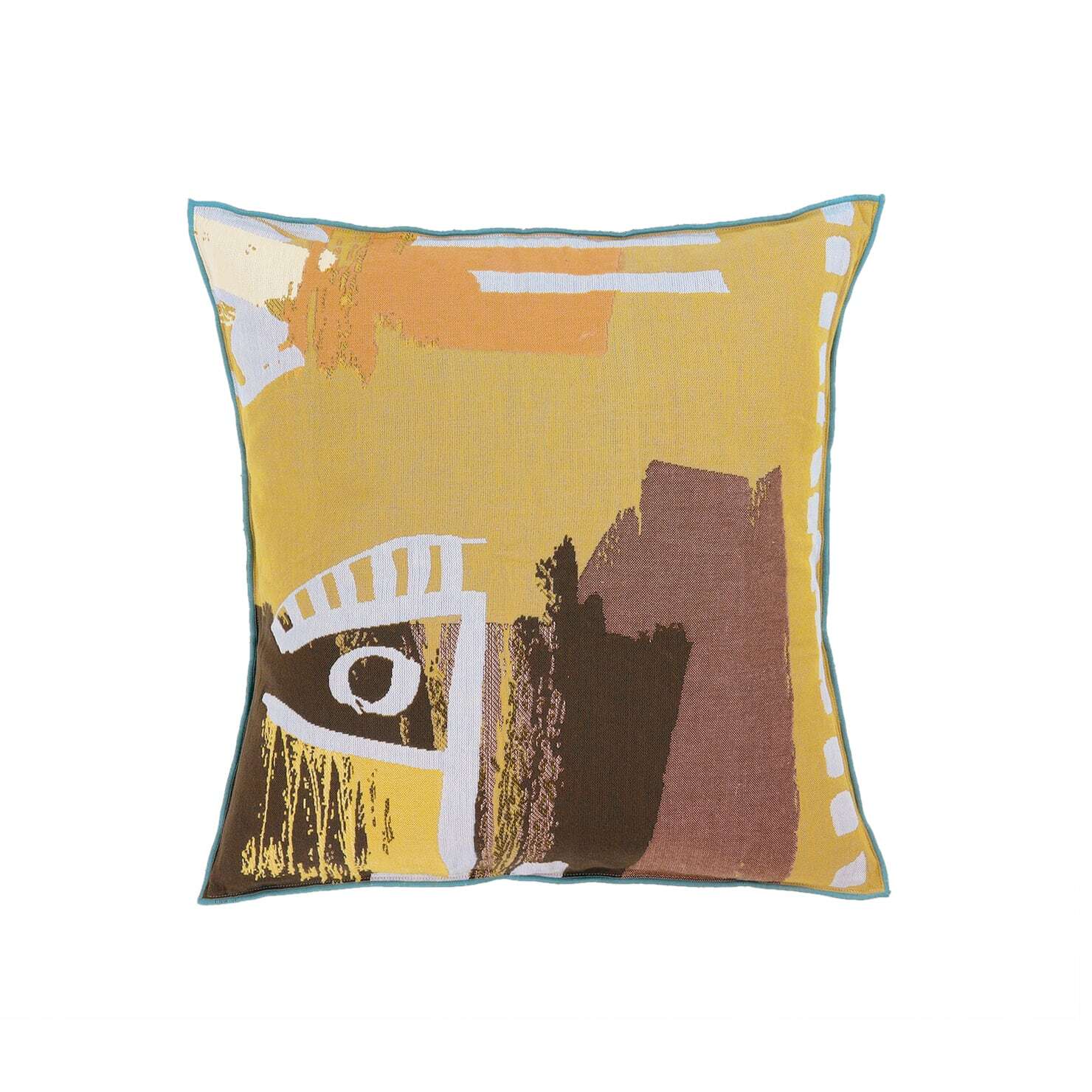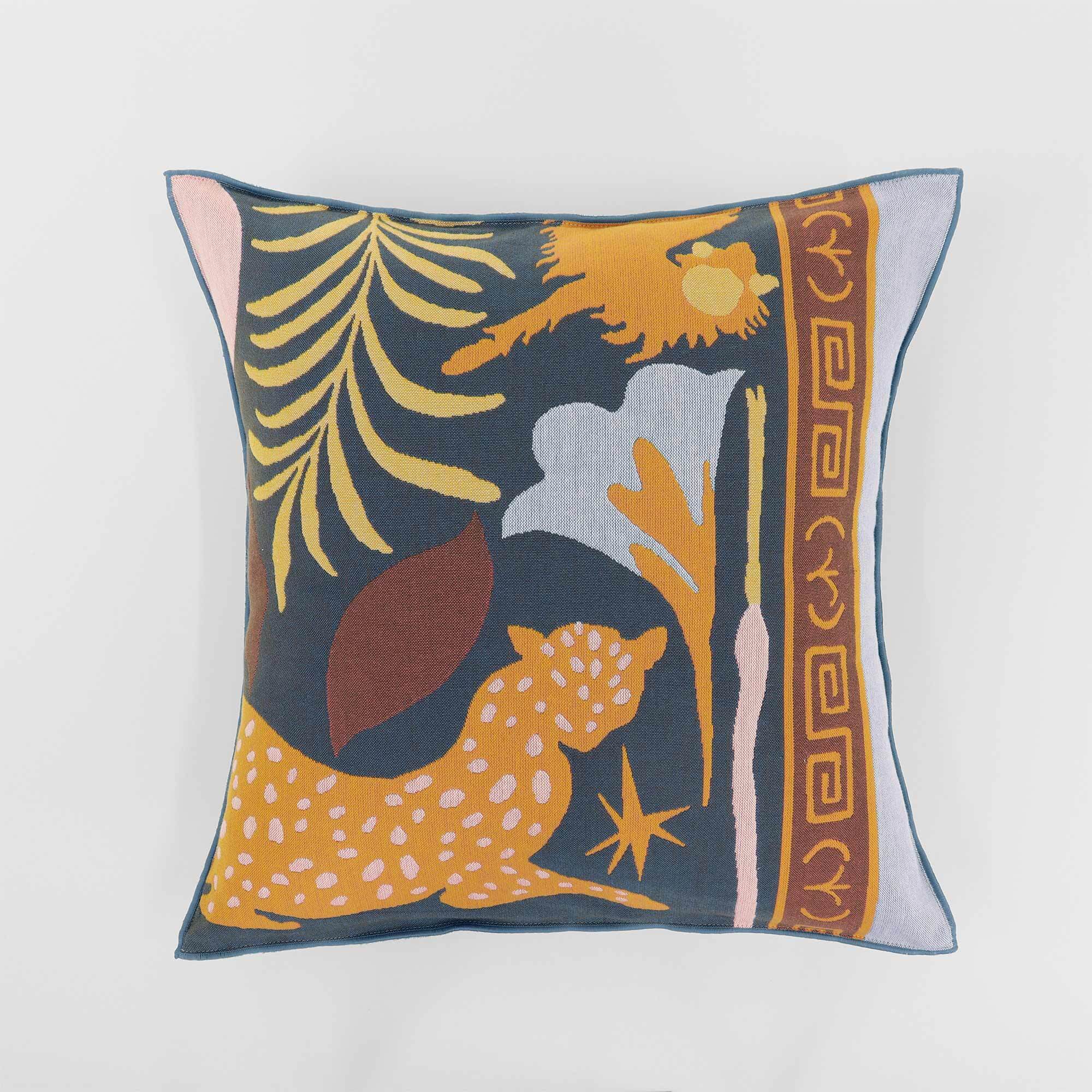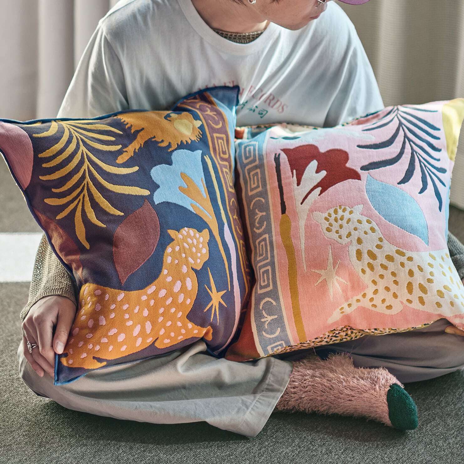 物語を切り取ったクッションカバーです。アジアの旅から着想を得たエネルギッシュなデザインです。私たちのルーツと自然の風景が溶け合うイメージをグラフィカルに構成しました。