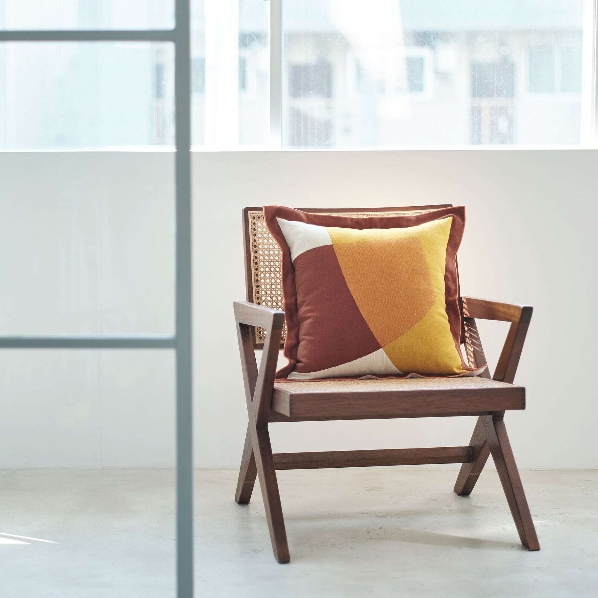 180年受け継がれた職人の技術と時代の感性をマリアージュするブランドのクラフトマンシップを前面に押し出したクッションカバー「エントアカネ」は、朝日と夕日の心地よさを”色”と”形”というシンプルな要素で再構築したテキスタイルの魅力をストレートに表現した一品です。