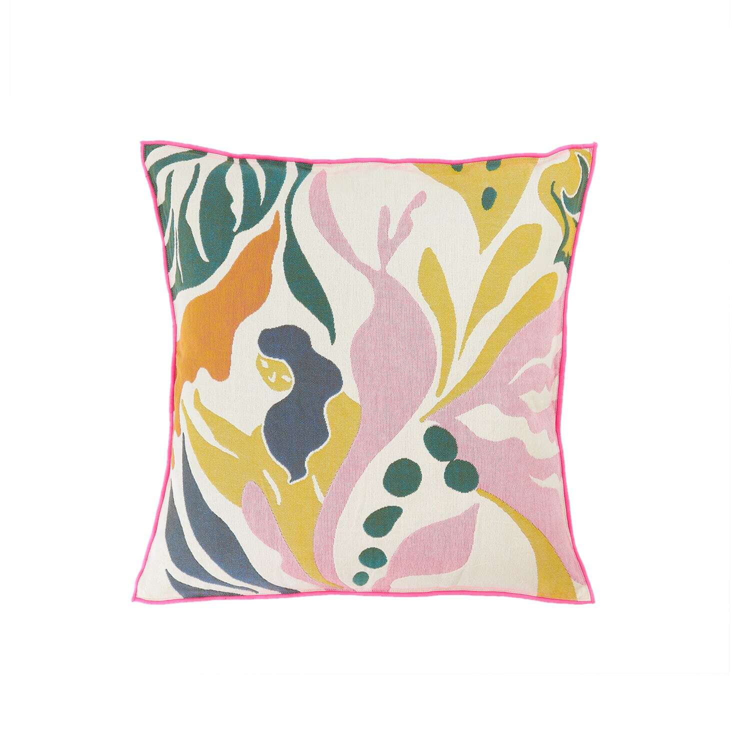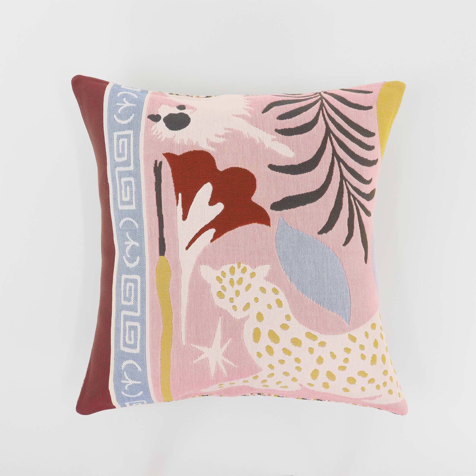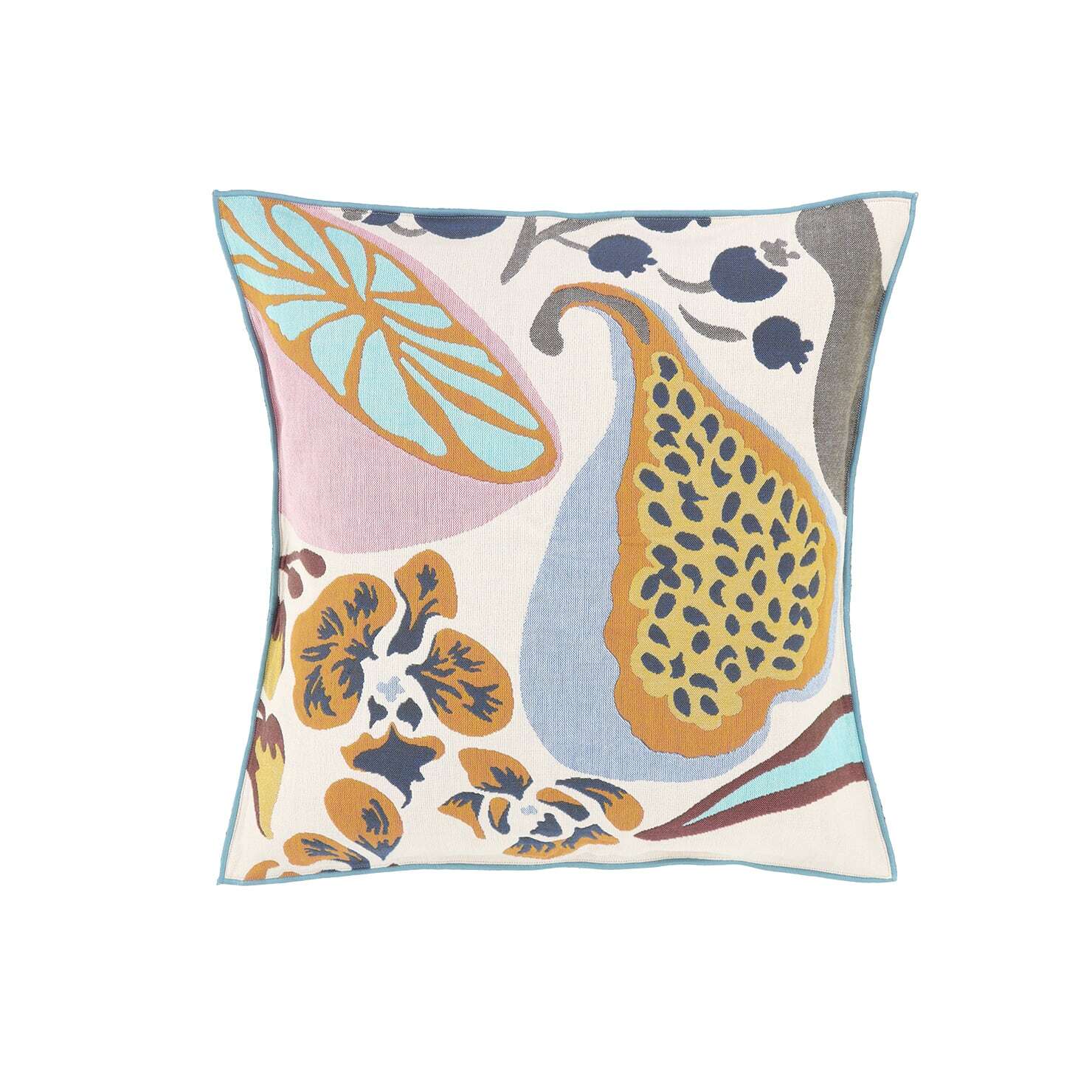 物語を切り取ったクッションカバーです。楽園をイメージして、生命を感じるみずみずしいモチーフをのびのびと描き、音楽に身体をゆだねた時のような軽やかな感覚を明るいトーンで表現しています。