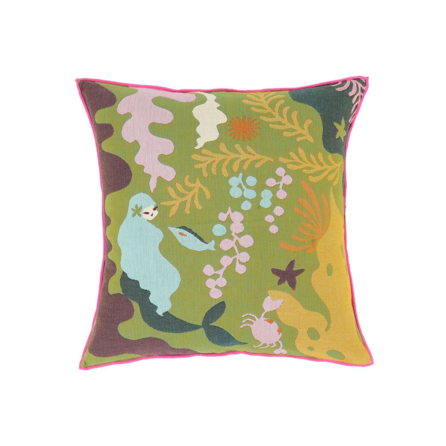 物語を切り取ったクッションカバーです。童話に出てくる人魚の入り江から着想を得ており、絵本が一枚の絵になったように小さなストーリーが隠れているデザインです。