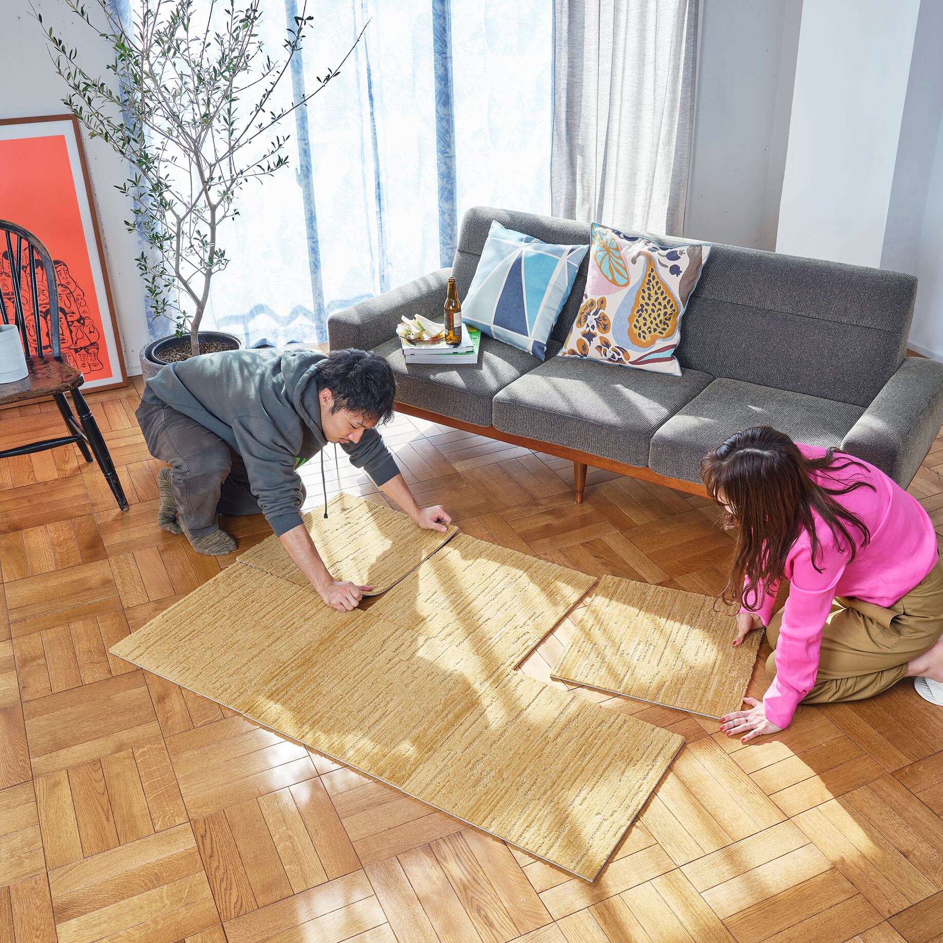 ラグのように敷いたりキッチンマットのように一列に並べたり自由にレイアウト出来ます。カッターで簡単に切れるので使用する場所に合わせてぴったり置く事が出来ます。