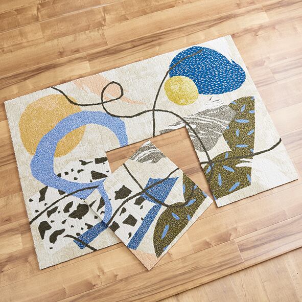 暮らしが明るく前向きな気持ちになるタイルカーペットです。のびのびとした線や形、楽しい色が合わさったデザインです。6枚セットでお届けします。ペットボトルを再生したフェルトを裏面に使った環境にもやさしいラグです。防炎、防音、滑り止め、床暖房OKなど、快適に過ごせる機能も充実。