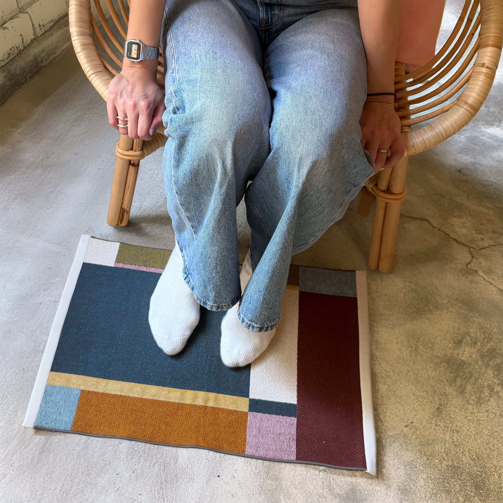 小さなマットだからこそ、使い方は自由自在。足元はもちろん、植物の下やアクセサリー置き場にも、気軽に取り入れられます。