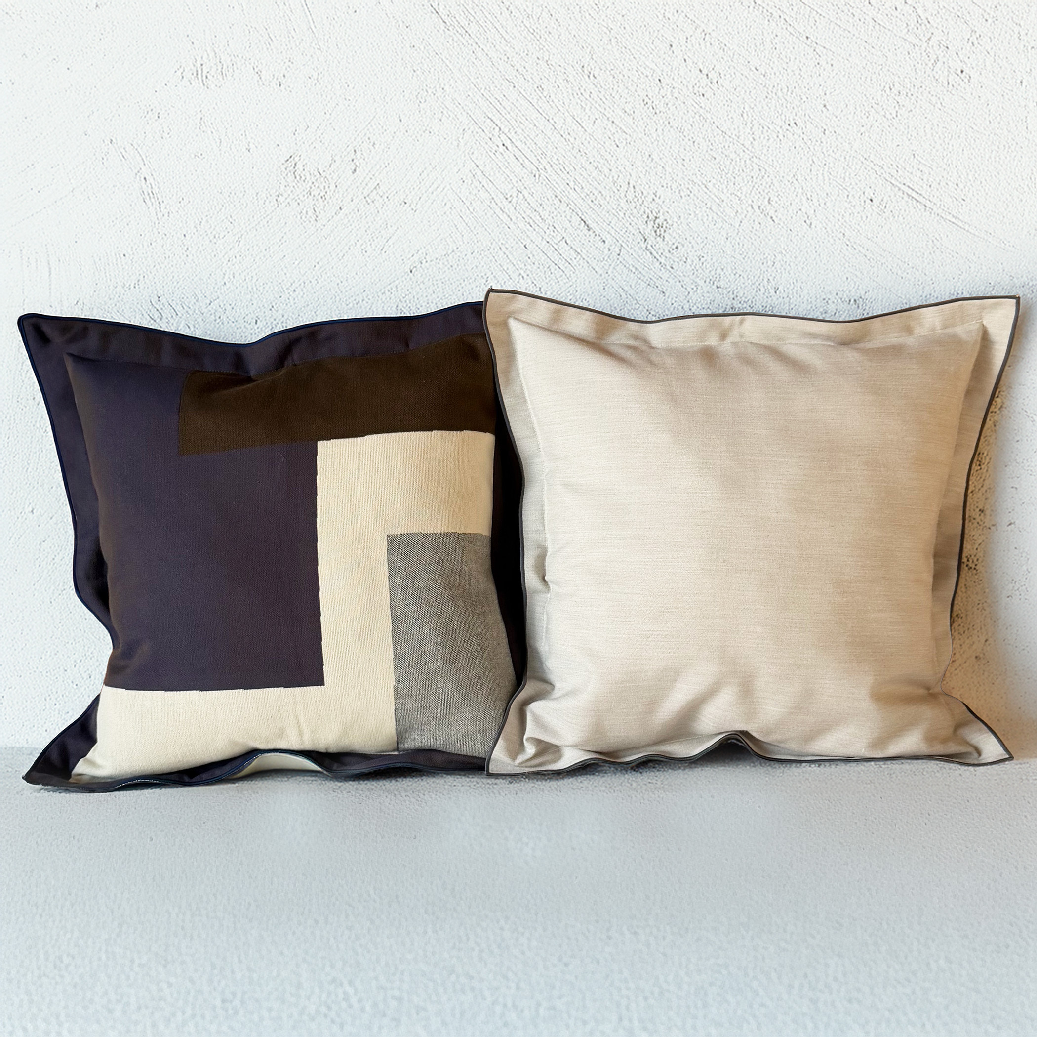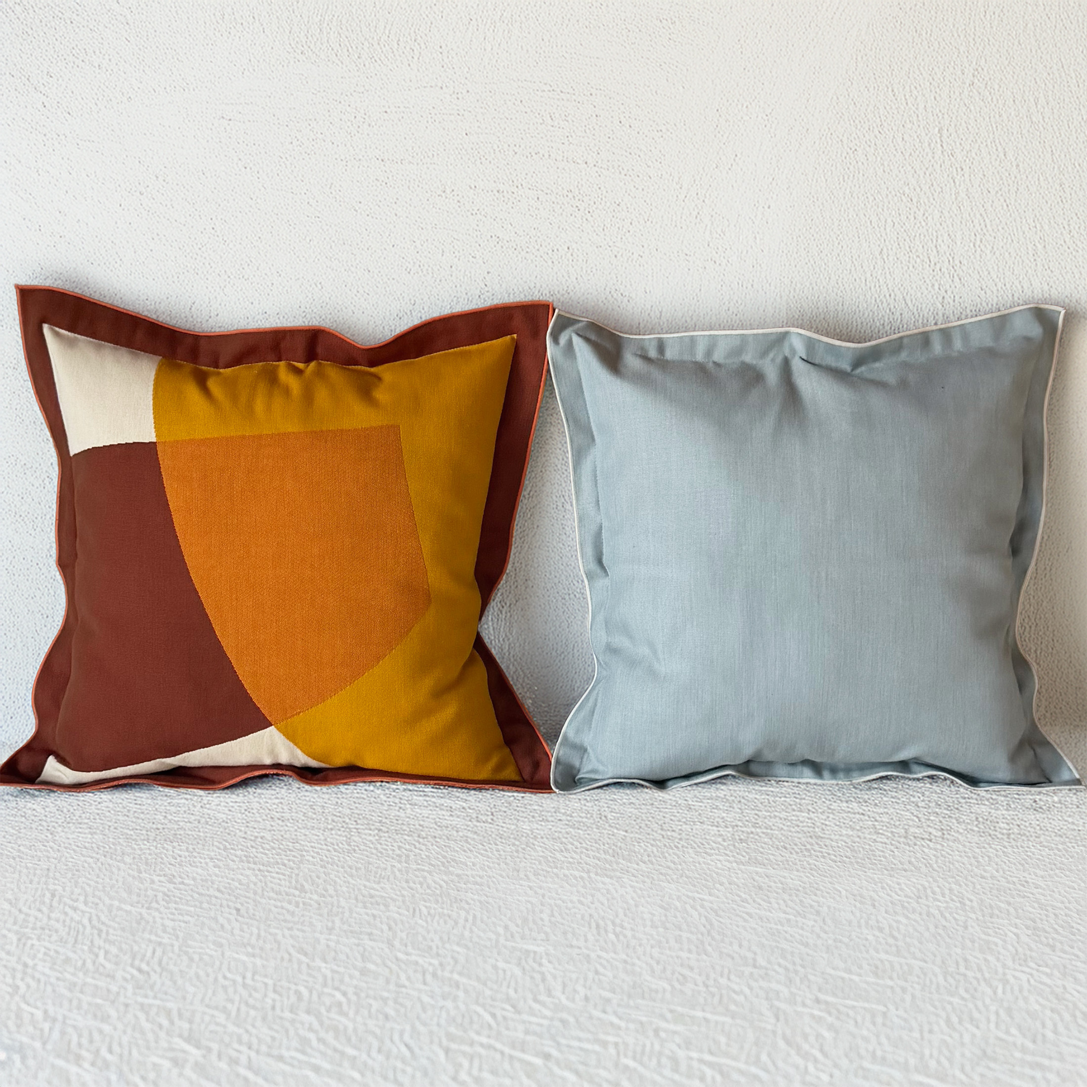 朝日と夕日の心地よさを"色"と"形"というシンプルな要素で再構築した「エントアカネ」と、マチと縁の配色が、さりげないアクセントになる「マチ クッション ライトブルー」のセットです。