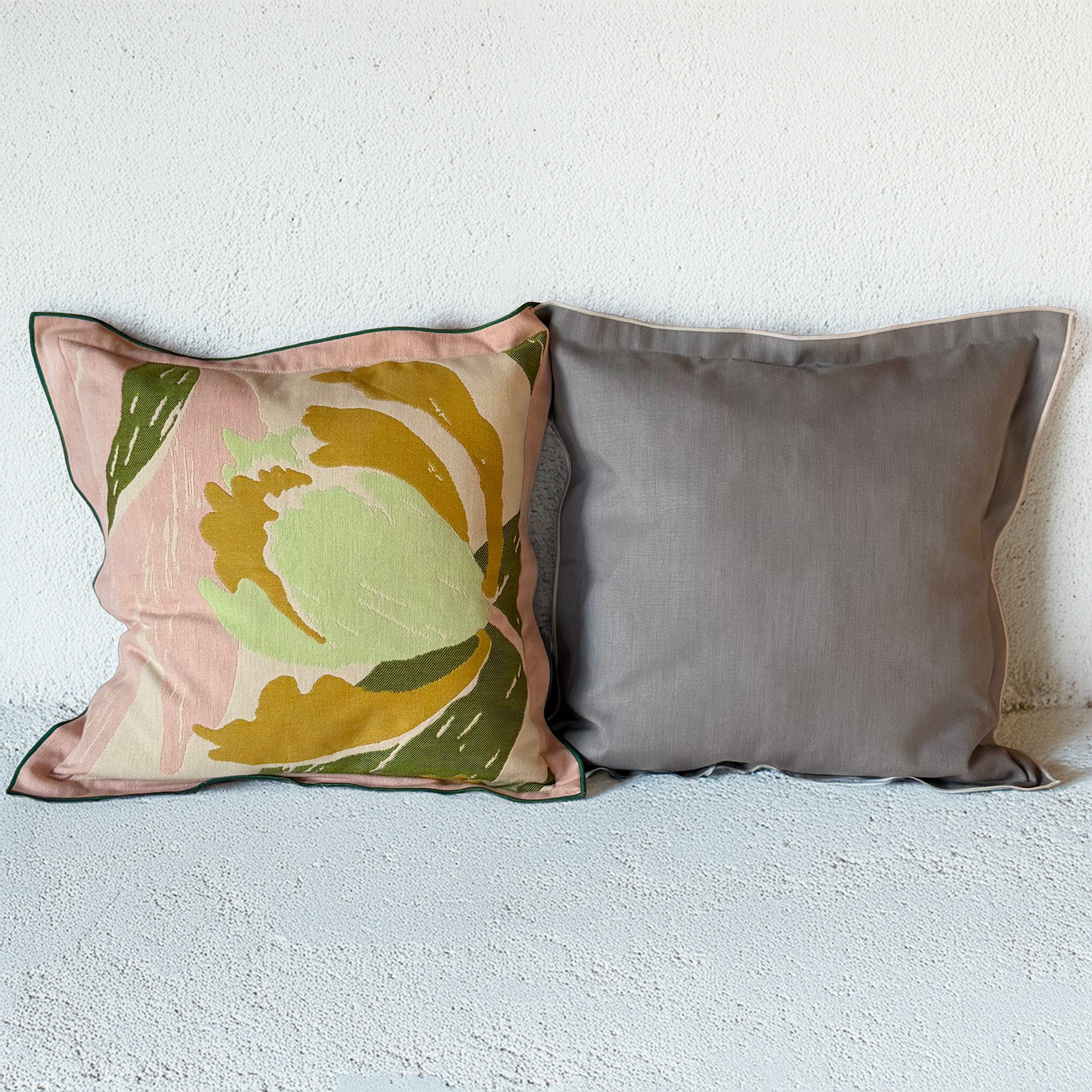 さまざまな愛の逸話をもつチューリップの魅力を"色"と"形"というシンプルな要素で再構築した「アイノメバエ」と、マチと縁の配色が、さりげないアクセントになる「マチ クッション ダークグレー」のセットです。