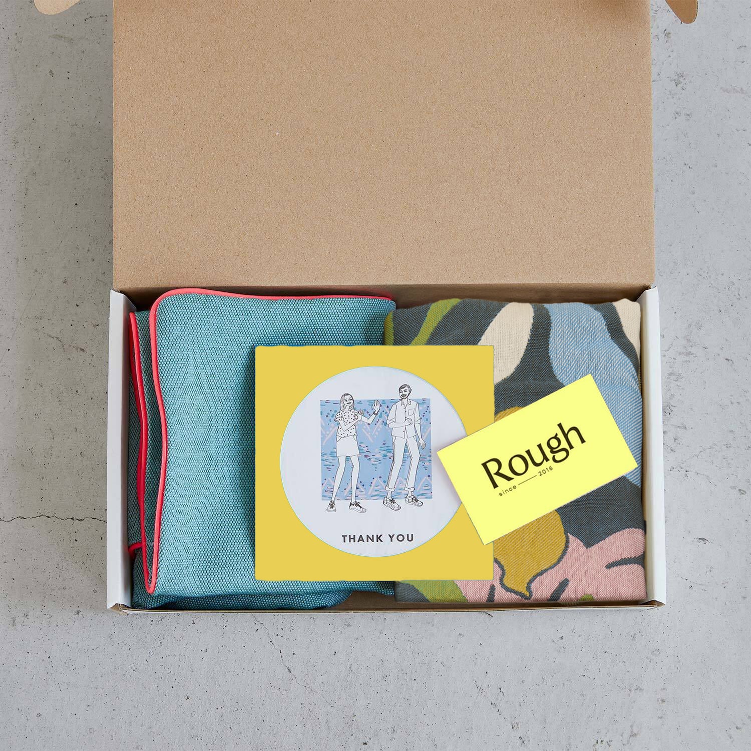 人気のクッションカバーをRoughのディレクターがコ―ディネートしてギフトセットを作りました。2種類のクッションカバーをBOXに入れてラッピングしてお届けします。