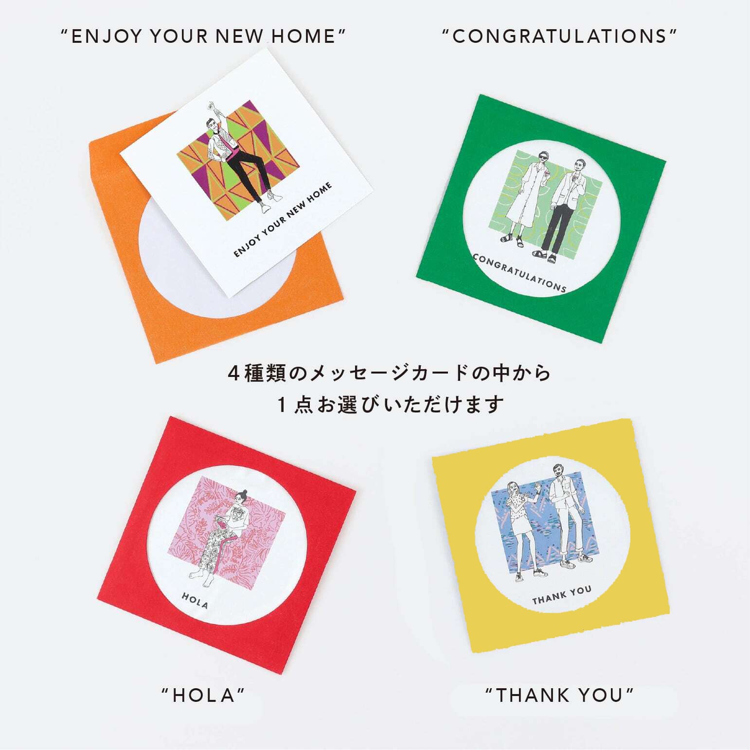 組み合わせは7種頼、メッセージカードは4種類、ステッカーは3種類の中からお選び頂けます。暮らしが明るくなるように願いを込めて選びました。引越し祝いやバースデーギフトにもおすすめです。